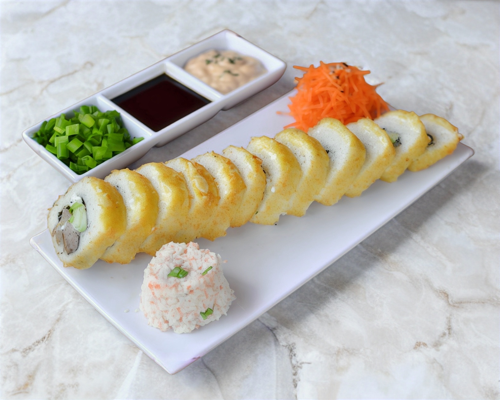 Rollo empanizado, relleno de res, aguacate, pepino, Philadelphia, forrado de queso manchego, queso Philadelphia y queso cheddar.