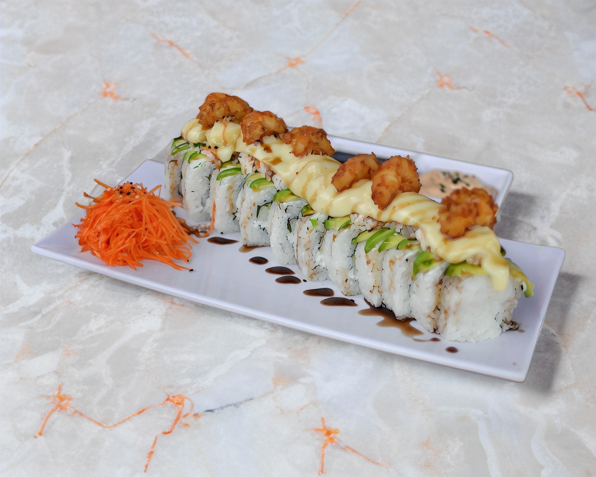Rollo horneado, relleno de camarón, aguacate, pepino, Philadelphia, forrado de tampico, camarón y gratinado en queso manchego, bañado en salsa de chipotle y anguila.
