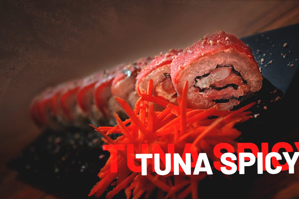Rollo natural.por dentro queso philadelphia, aguacate, pepino forrado de atún, aderezo acevichado y furikake.