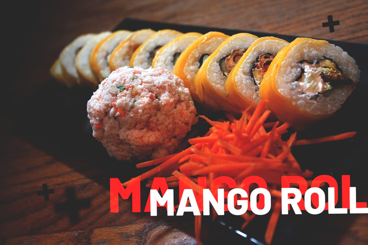 Rollo Natural. Por dentro camarón empanizado, queso philadelphia, aguacate y pepino. forrado con mango. Acompañado de ensalada surimi, aderezo de mango, piña y chipotle.