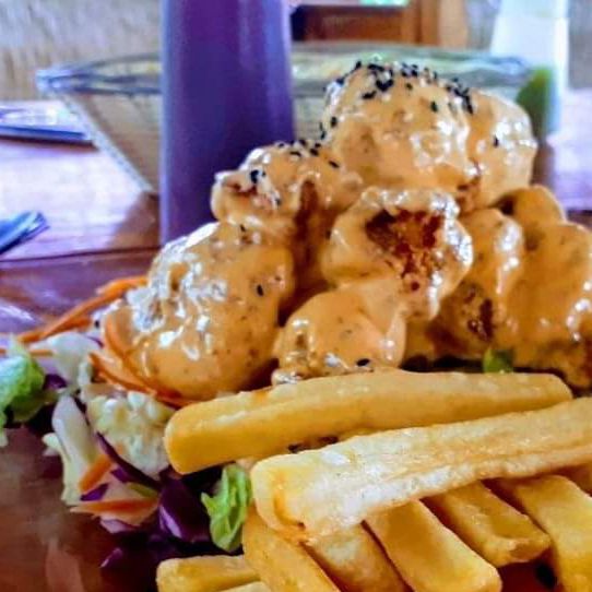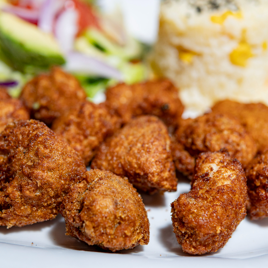 12 Piezas Chicharrón de Botete , acompañado de arroz y ensala.