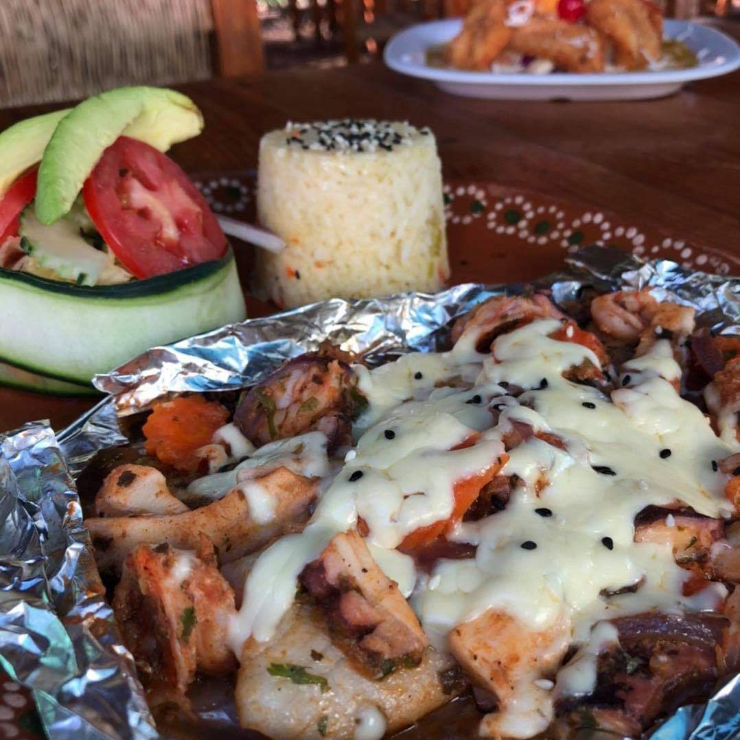 Pescado, camarón crudo, cocido, pulpo y lobina. y salsa de Mitotero (salsas adicionales a elección con costo)