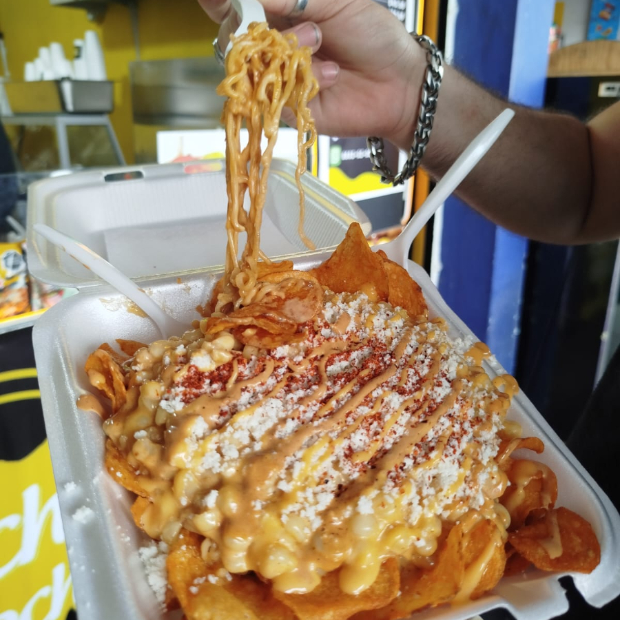 Vaso de elotes, preparado con queso especial amarillo, acompañado con chettos flaming hot