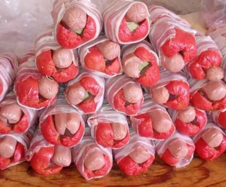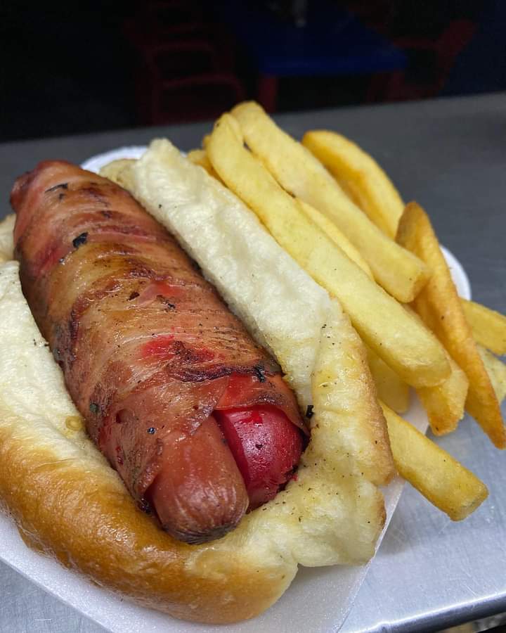 salchicha, tomate, cebolla, aderezos, porción pequeña de papas