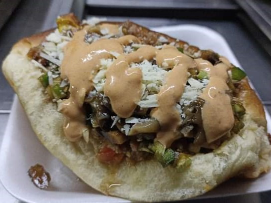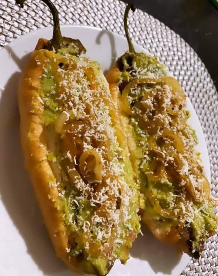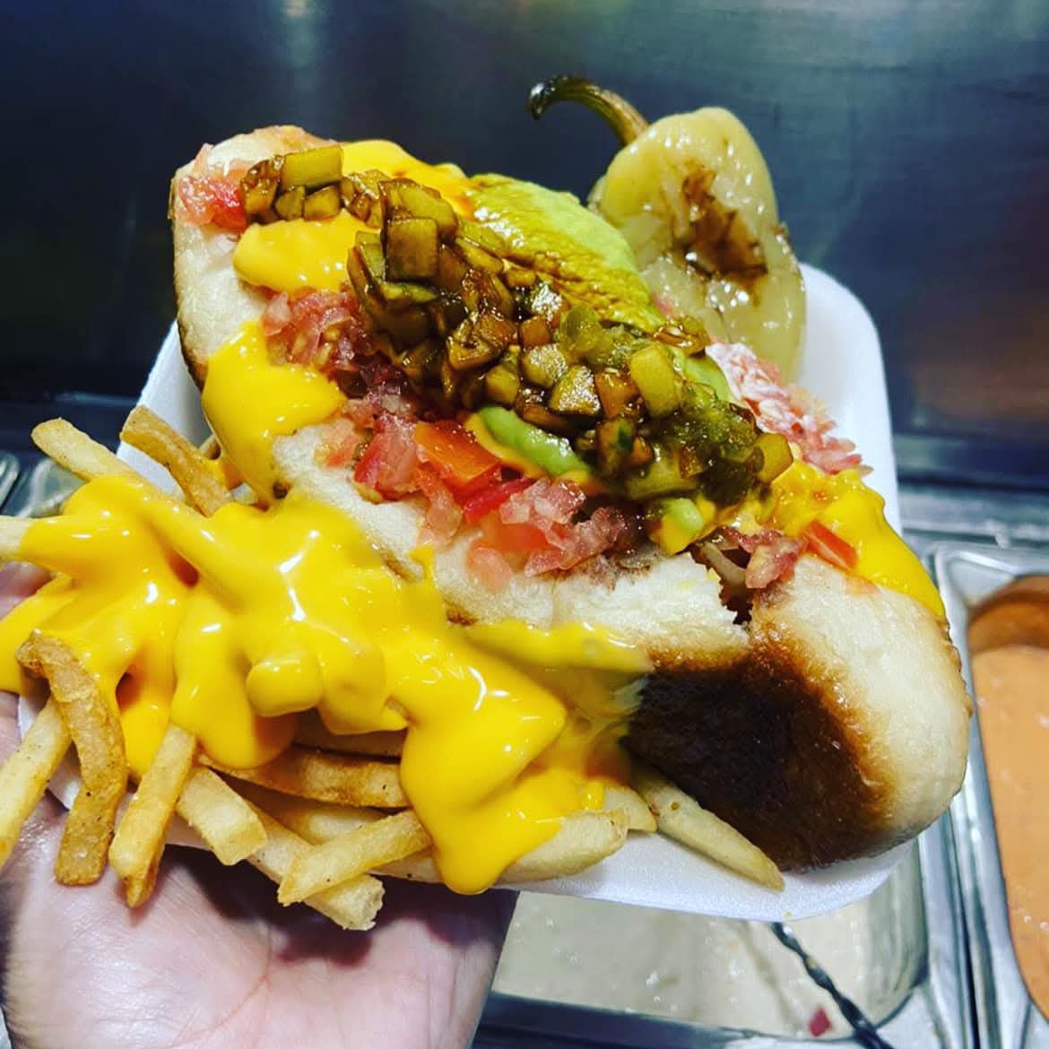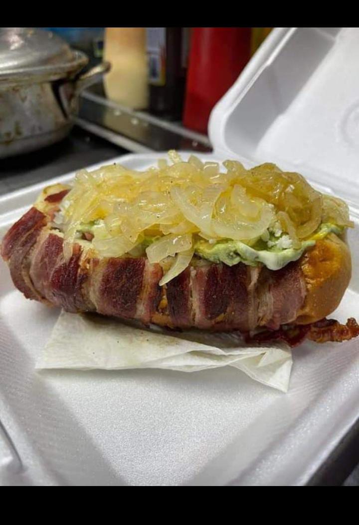 Jamón, queso chihuahua, queso americano, queso Filadelfia, salchicha, aderezo, tomate, cebolla, aguacate.