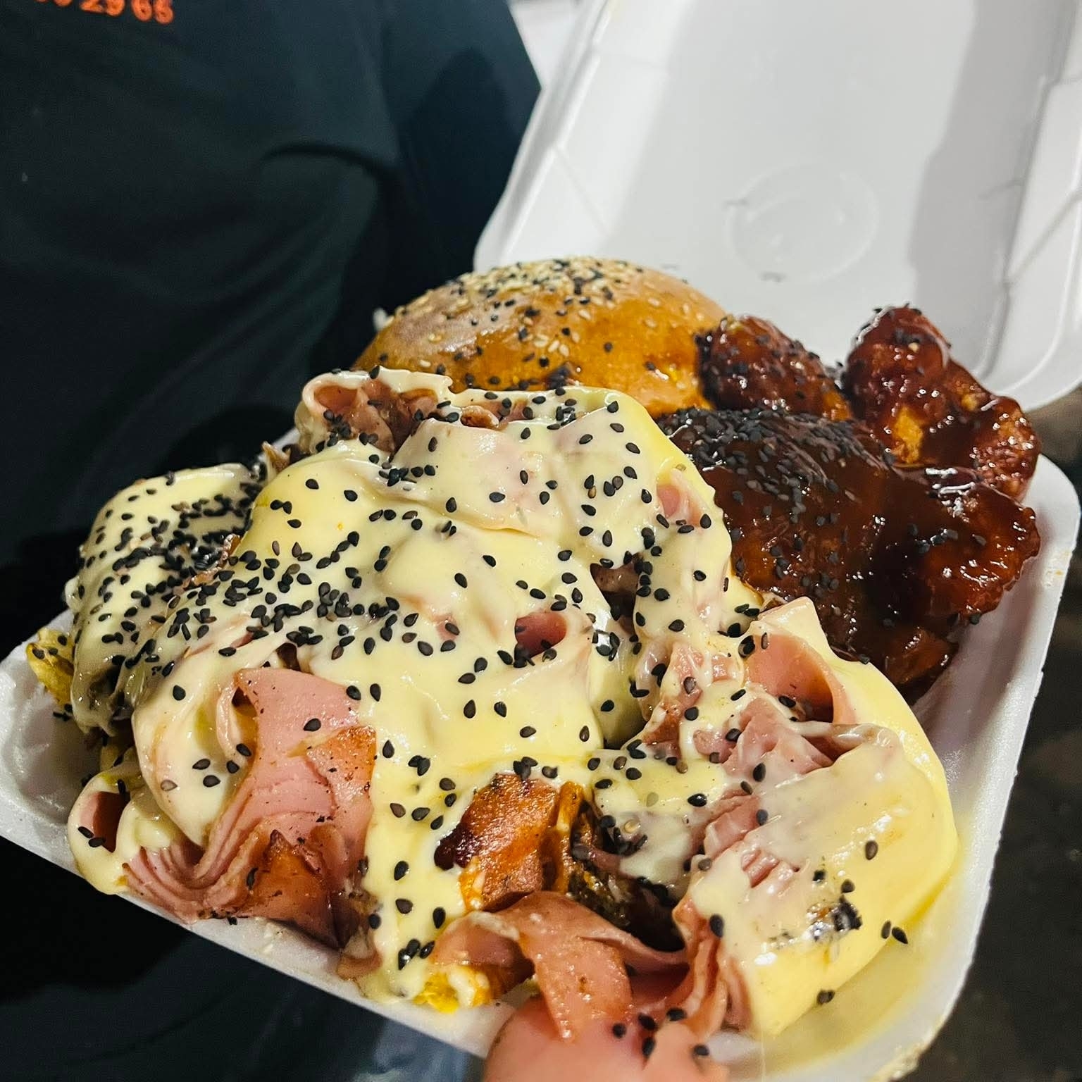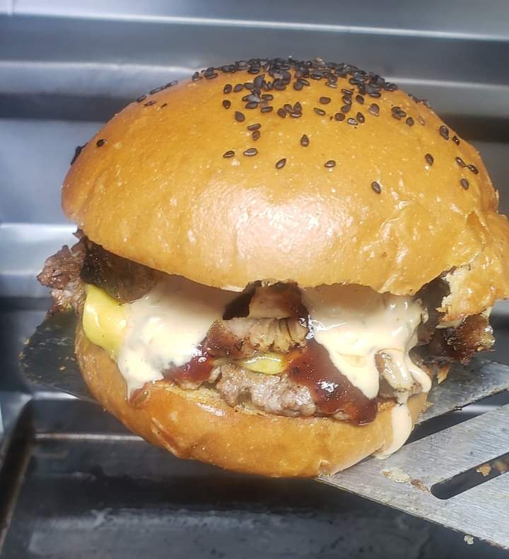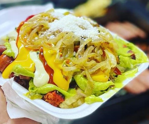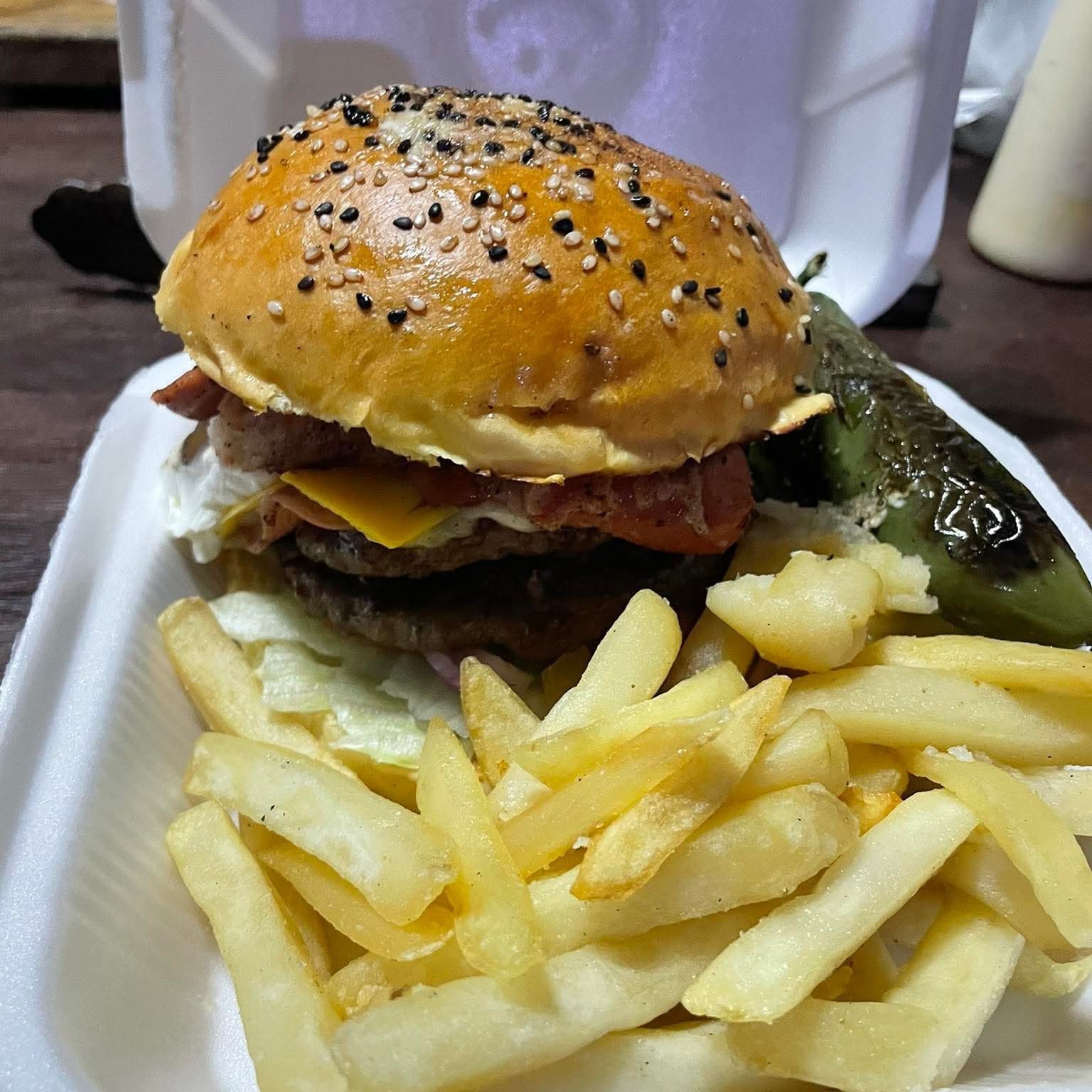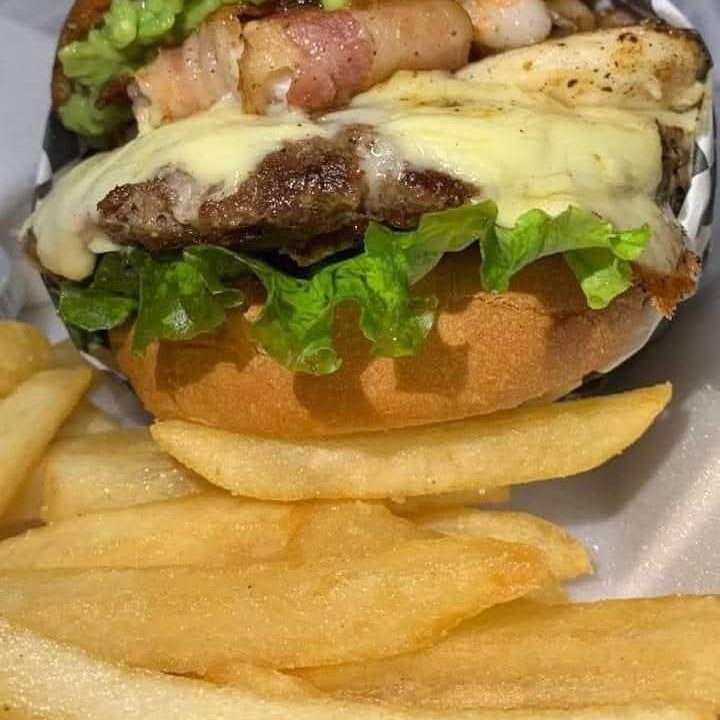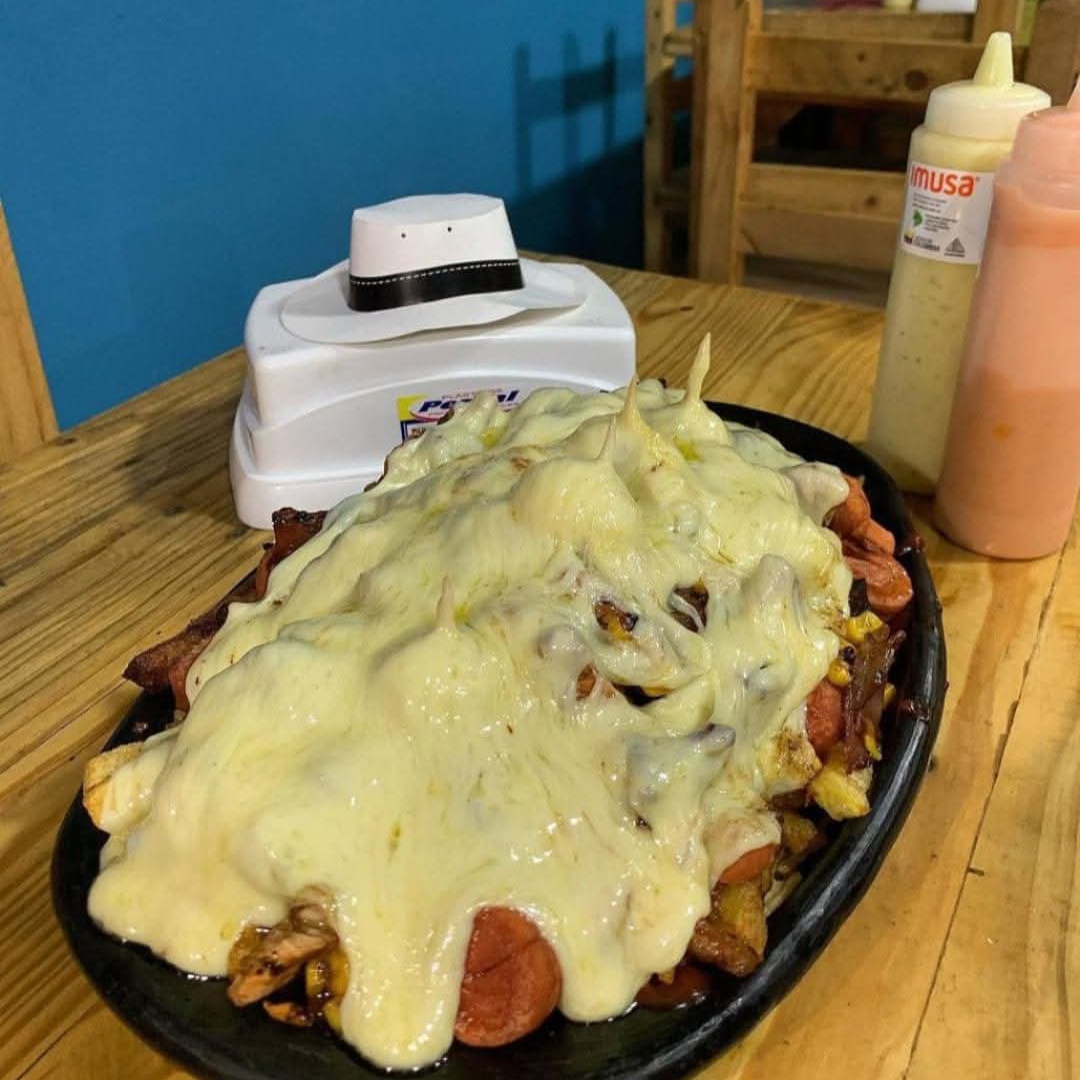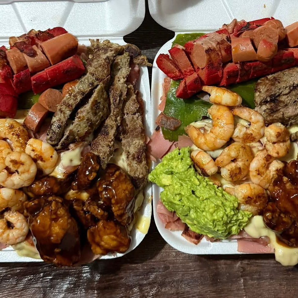 Para 3 a 4 personas. 1 hamburguesa especial, boneless, camarones, carne, 1 salchicha para asar,1 salchicha normal, 1 chile relleno de 3 quesos, papas, base de queso gratinado, jamón, aguacate y aderezo