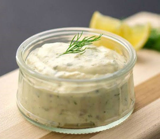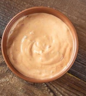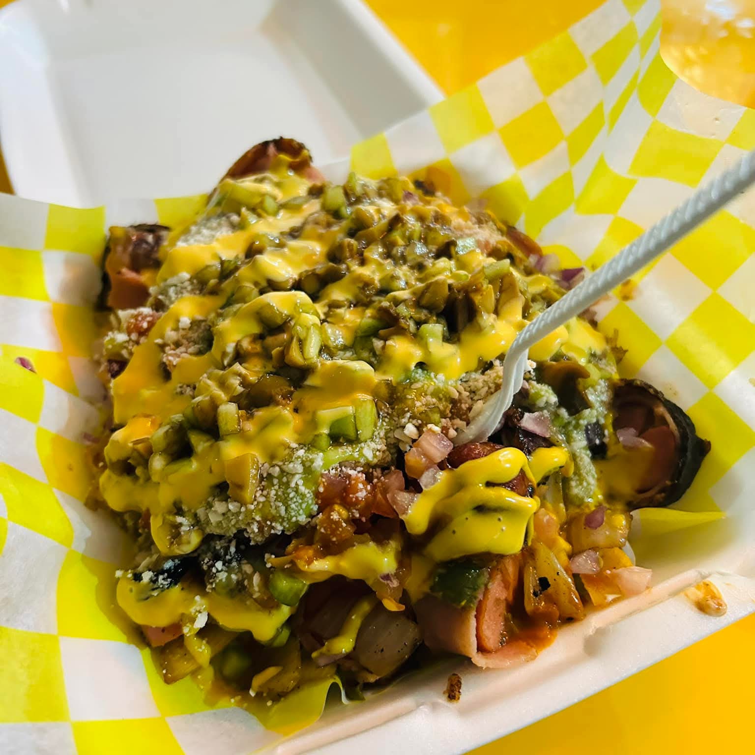 Salchicha, porción pequeña de papas y aderezo, cebolla picada.
