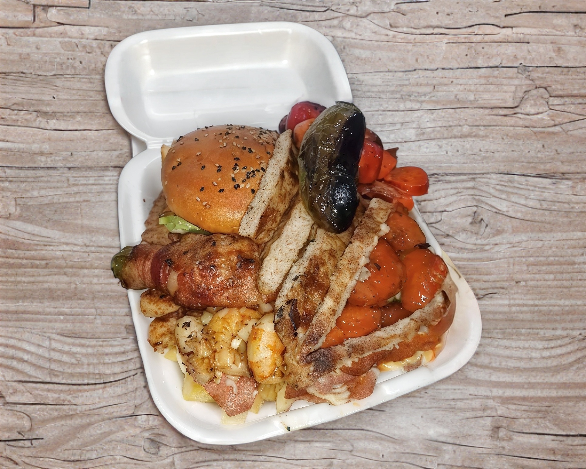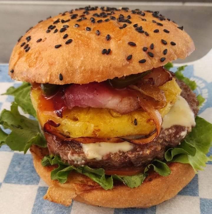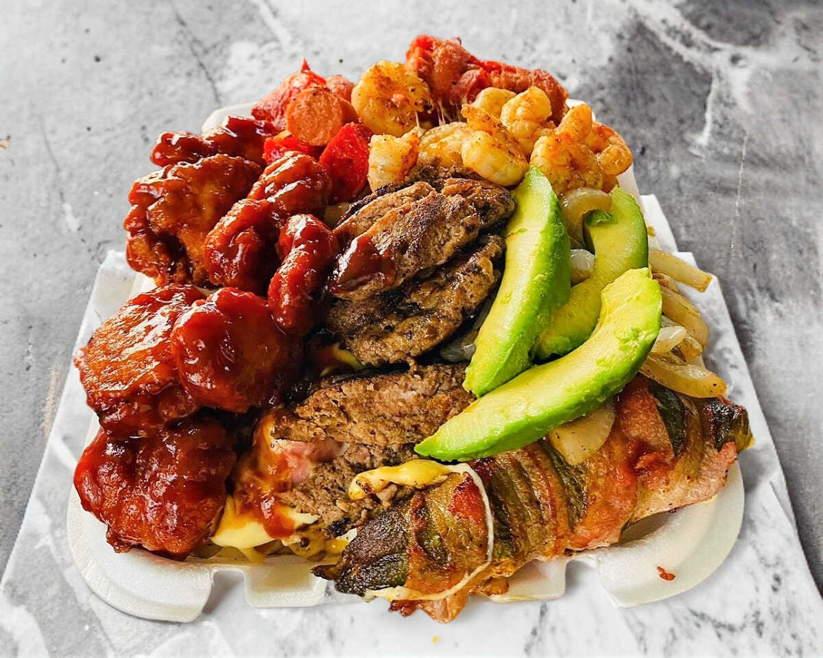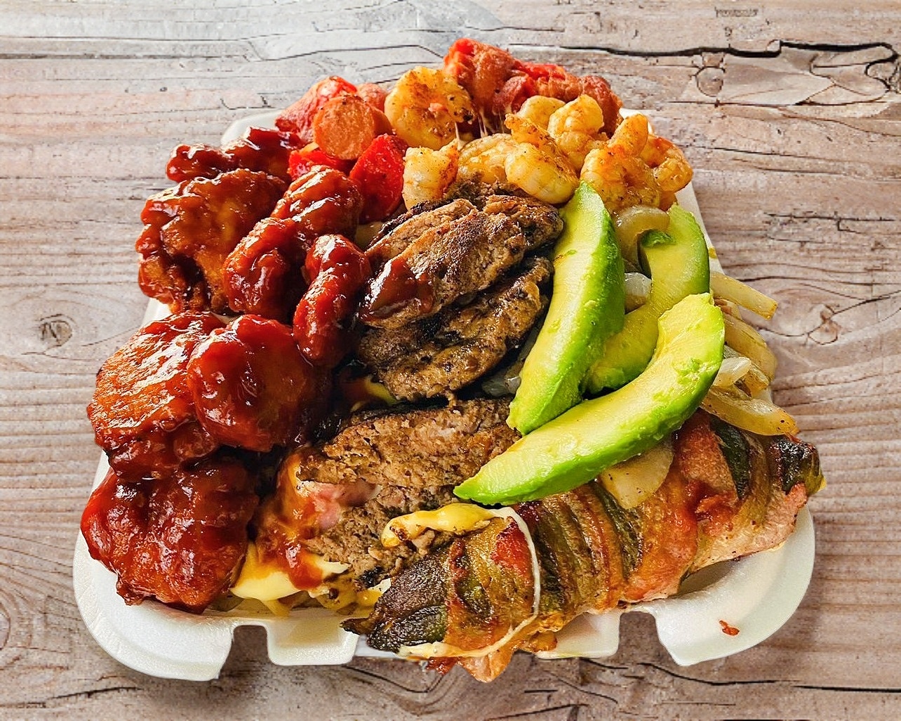 Para 3 a 4 personas. 1 hamburguesa especial, boneless, camarones, carne, 1 salchicha para asar,1 salchicha normal, 1 chile relleno de 3 quesos, papas, base de queso gratinado, jamón, aguacate y aderezo