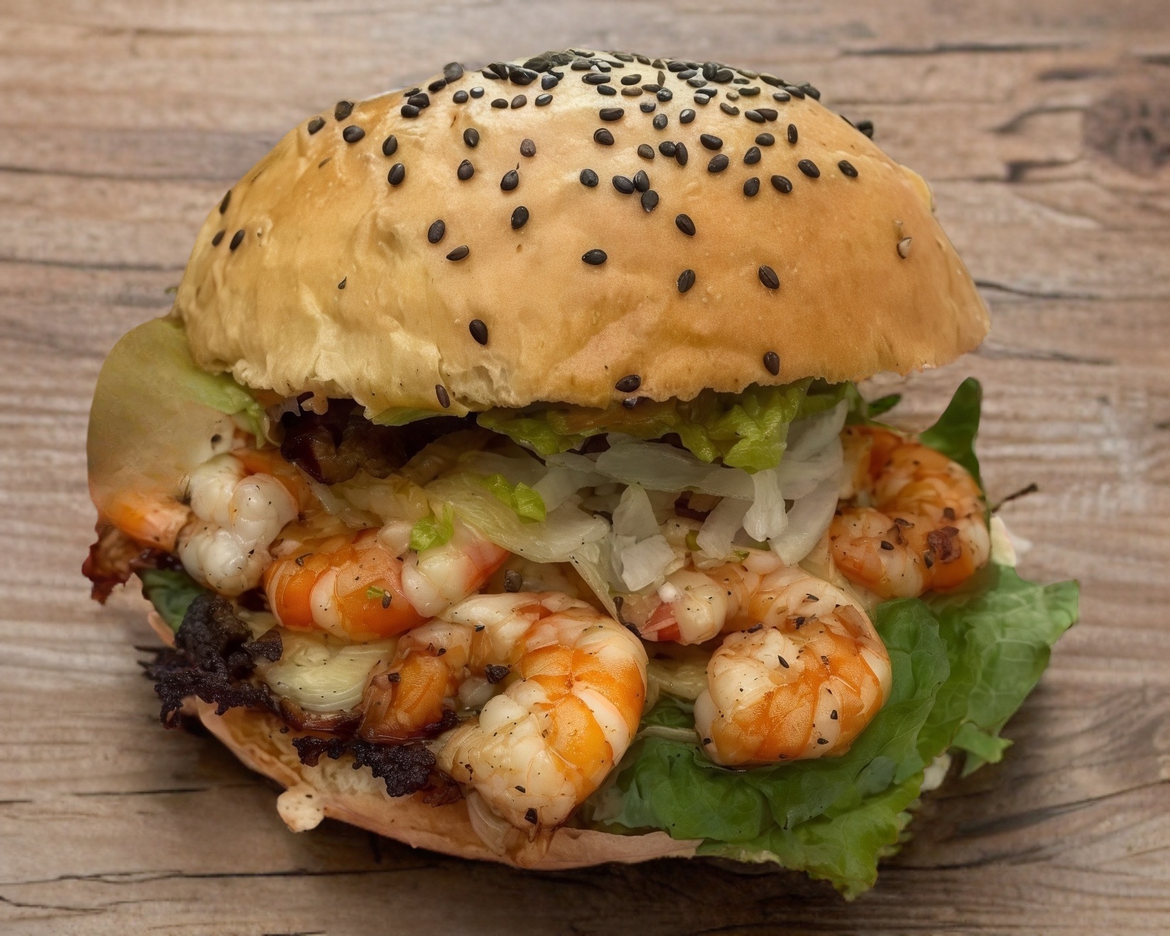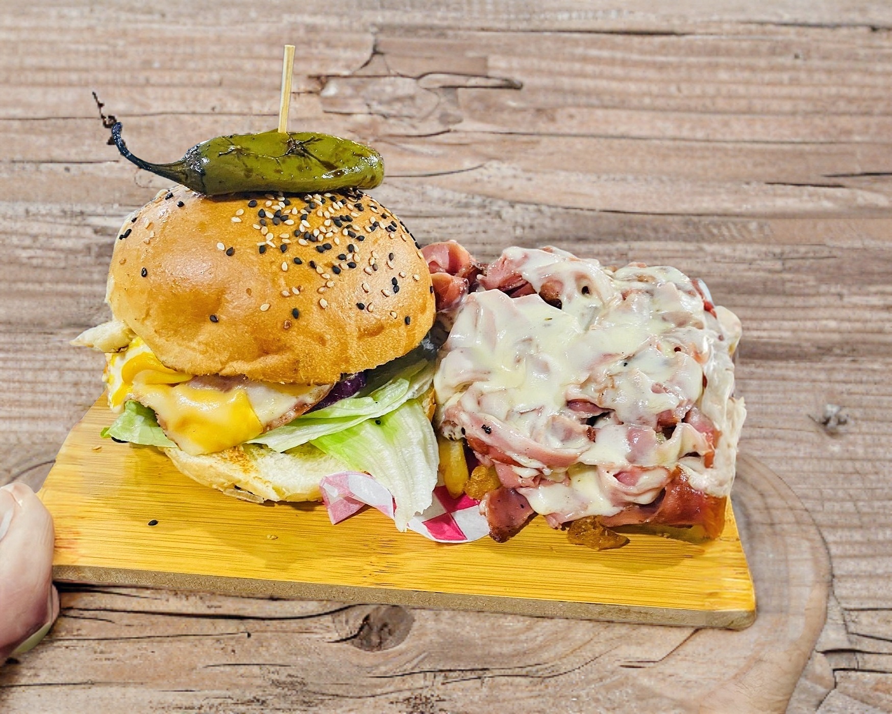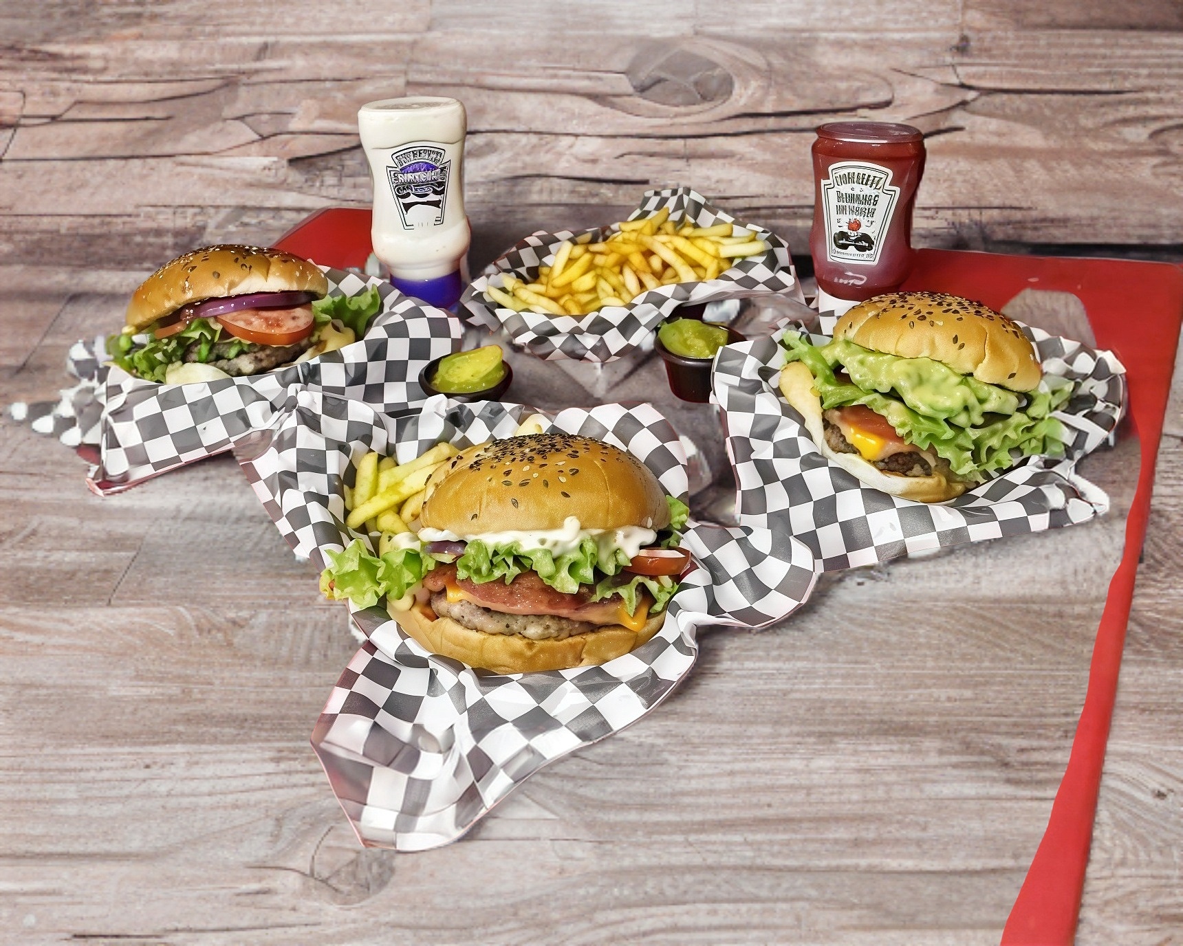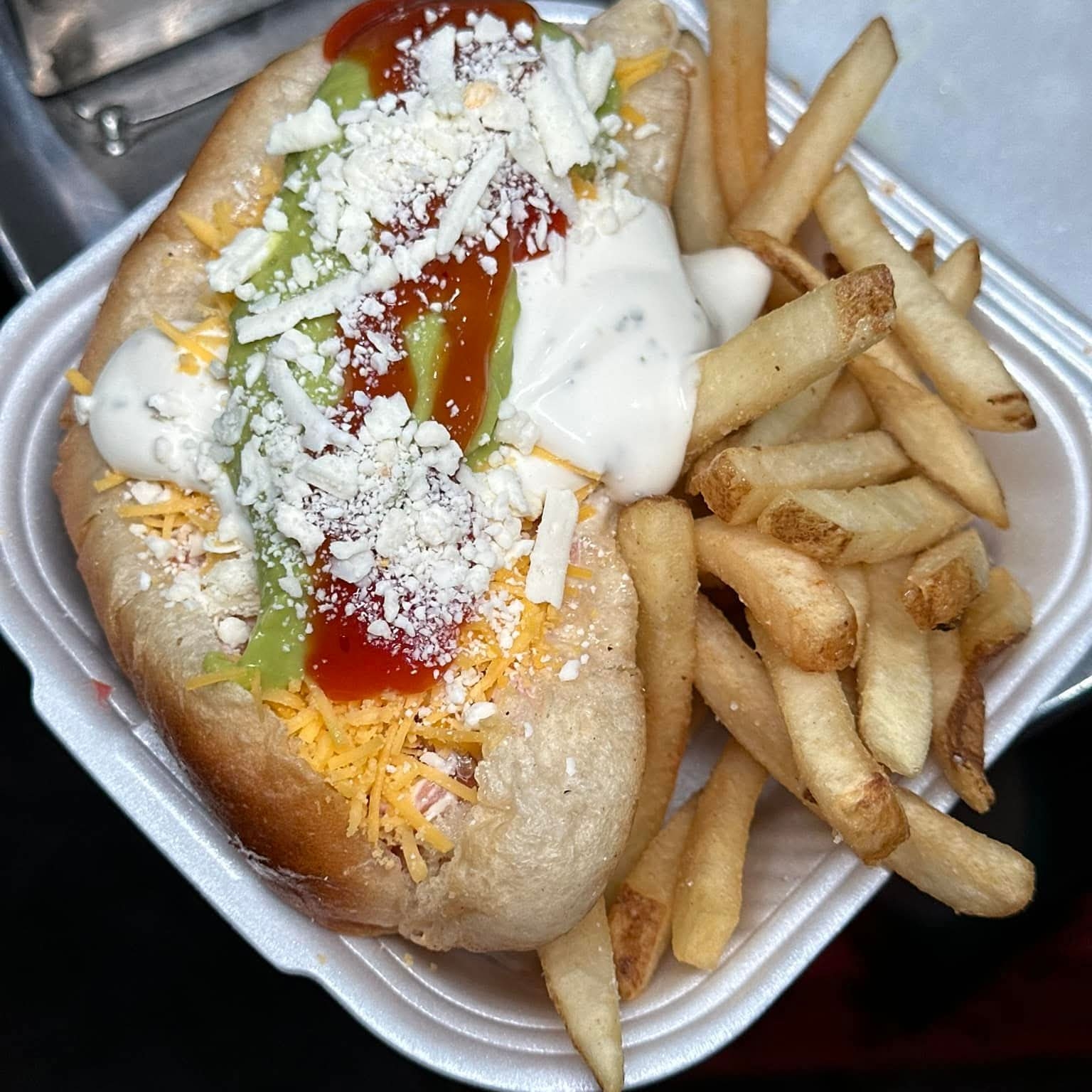 Para 3 a 4 personas. 1 hamburguesa especial, boneless, camarones, carne, 1 salchicha para asar,1 salchicha normal, 1 chile relleno de 3 quesos, papas, base de queso gratinado, jamón, aguacate y aderezo
