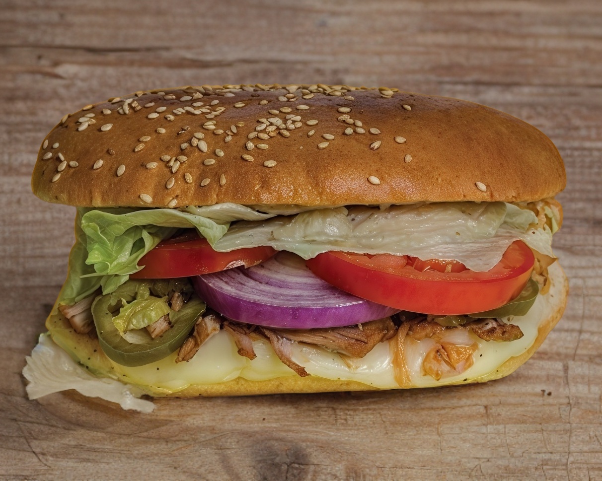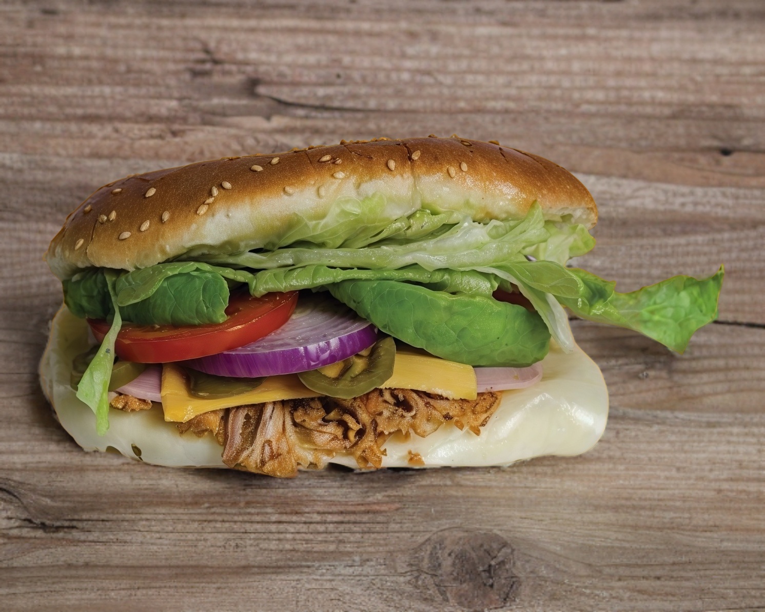 Pan telera relleno de carne de pierna desmenuzada, una rebanada de jamón, queso Oaxaca, aguacate, lechuga, tomate, cebolla y chile. Se entrega en una pieza. (Porción personal)