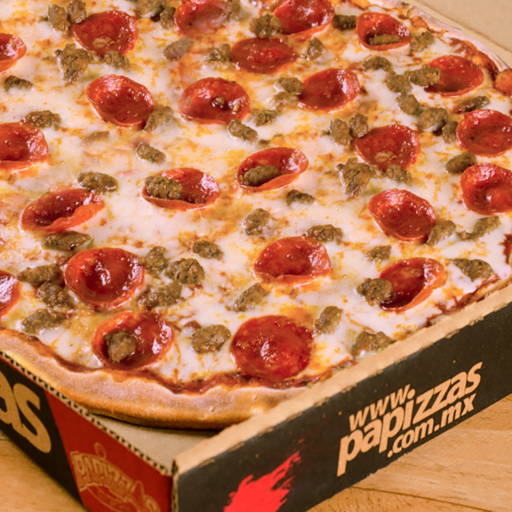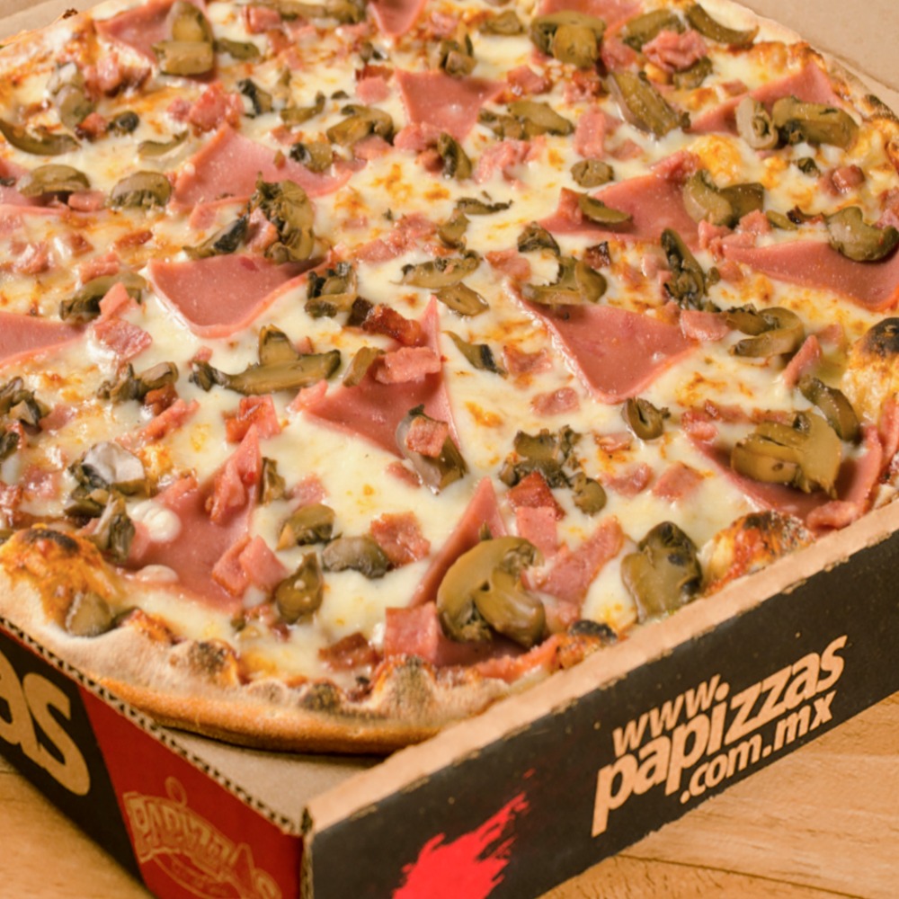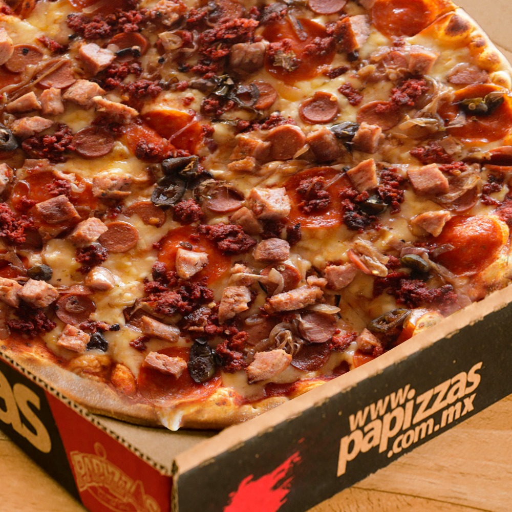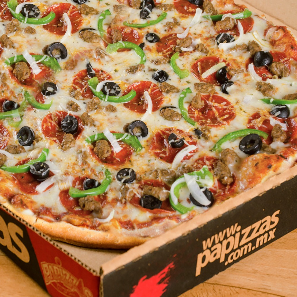 Peperoni, salchicha italiana, aceituna negra, morron, cebolla blanca, y parmesano