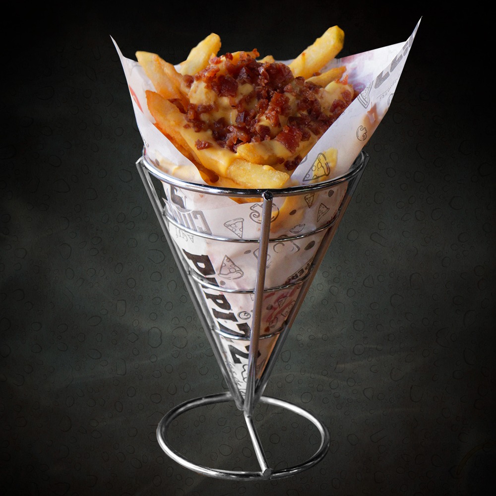 papas fritas bañadas de queso cheddar, acompañadas de catsup