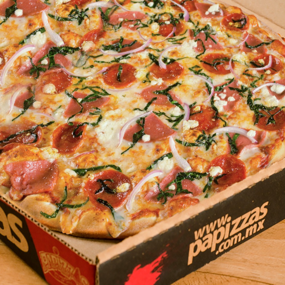 Peperoni, Salami, Cebolla Morada, Espinaca y Queso de Cabra