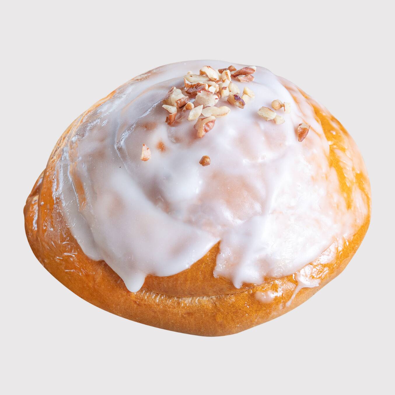 Pan de vainilla tipo esponja totalmente bañado, con duraznos y nuez.