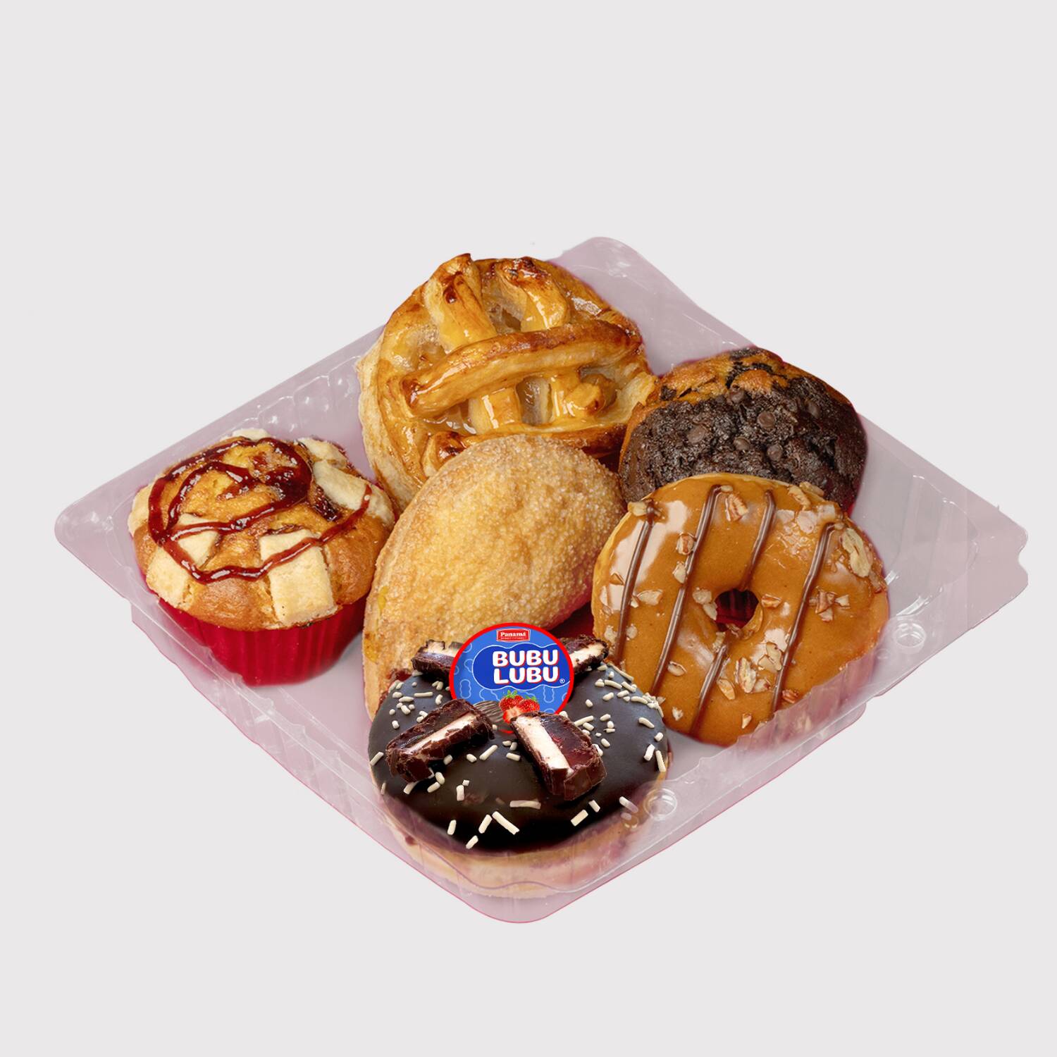 1 Muffin con zarzamora y pasta de dona, 1 Dona bubulubu, 1 Muffin marmoleado, 1 Empanada piña, 1 Dona nuez, 1 Tartaleta de manzana.
