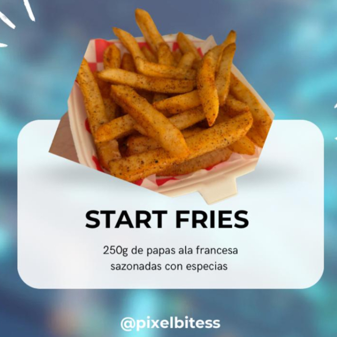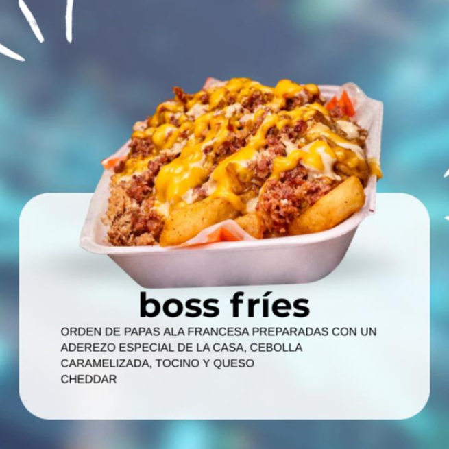 Papas a la francesa sazonadas 250g, bañadas en queso cheddar, aderezo de la casa, cebolla caramelizada y tocino.