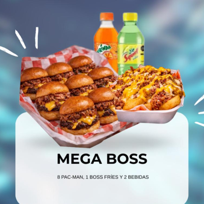 8Pac-man acompañadas de una orden de boss fries, 1 dip de queso cheddar y 2 bebidas