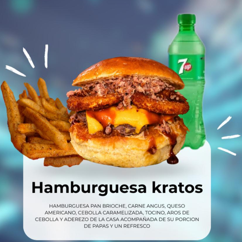 Hamburguesa pan brioche, carne angus, queso americano, cebolla caramelizada, tocino, aros de cebolla,bbq y aderezo de la casa. Acompañada de su porcion de papas a la francesa y un refresco.