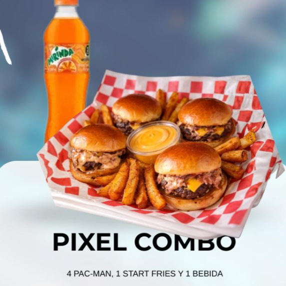 4 Pac-Man acompañadas de papas a la francesa, 1 dip de queso cheddar y 1 bebida.
