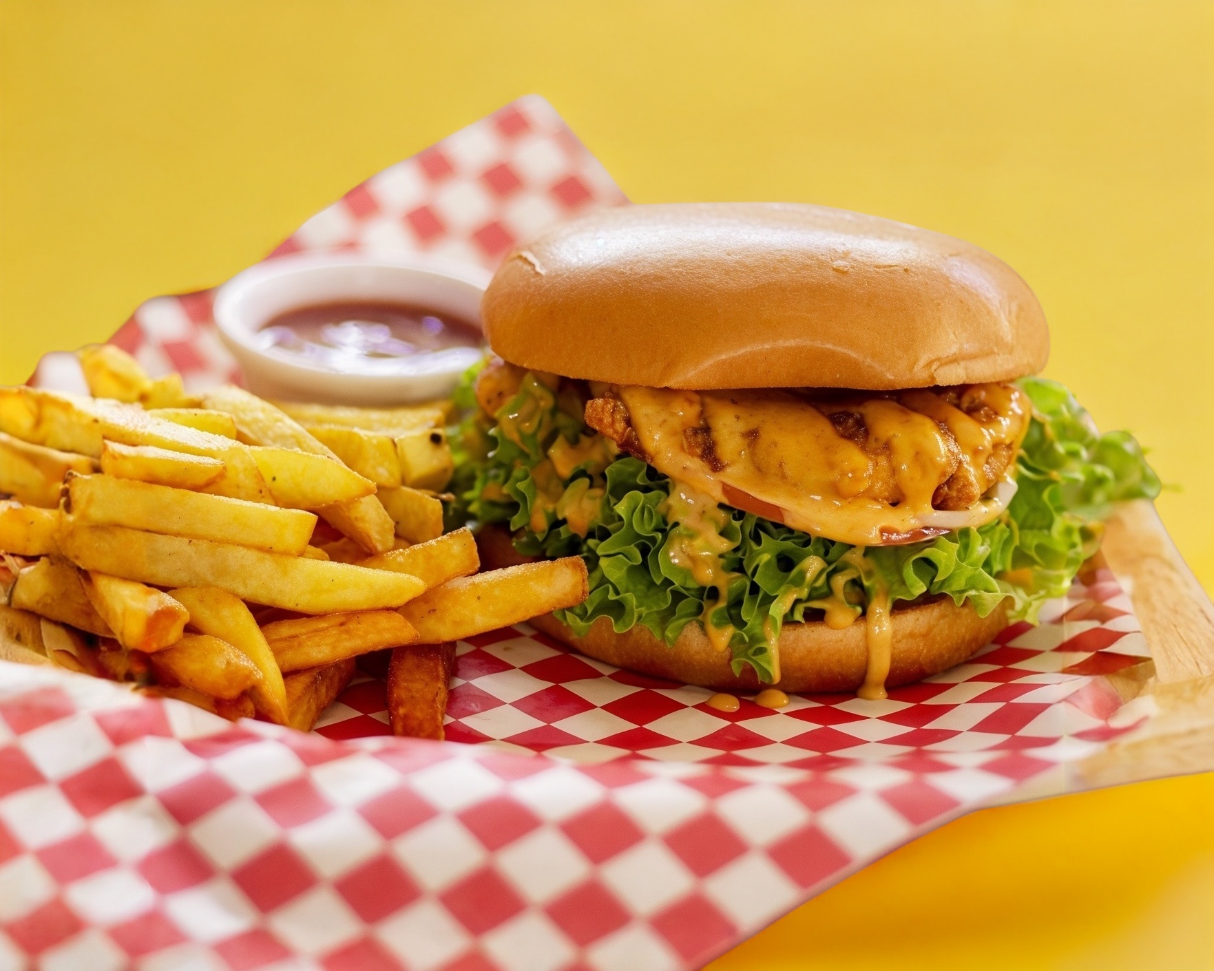 Hamburguesa de pollo empanizado, bañado con nuestro aderezo especial, pan brioche, lechuga, tomate, cebolla. Acompañada de crujientes papás a la francesa y catsup.