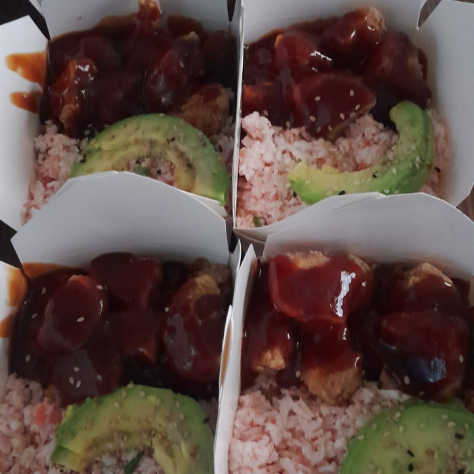 16 oz arroz yakimechi, Tampico, aguacate, Philadelphia, bonneles BBQ o BUFALO