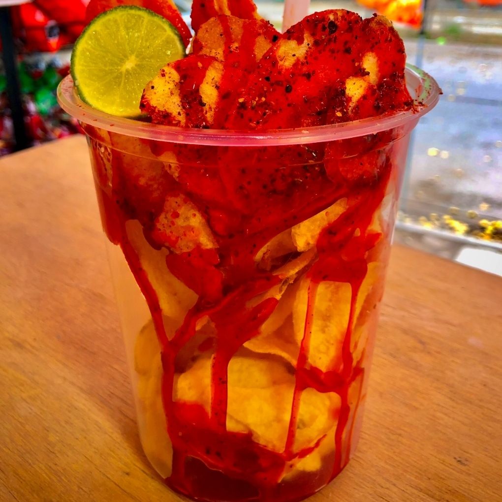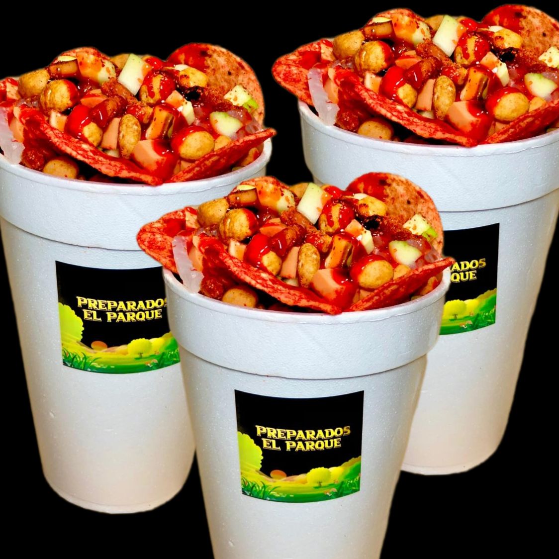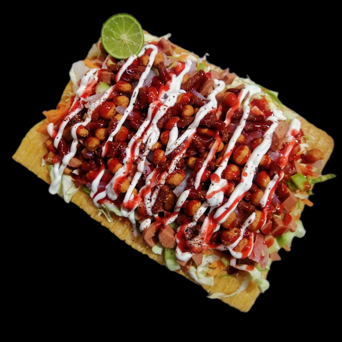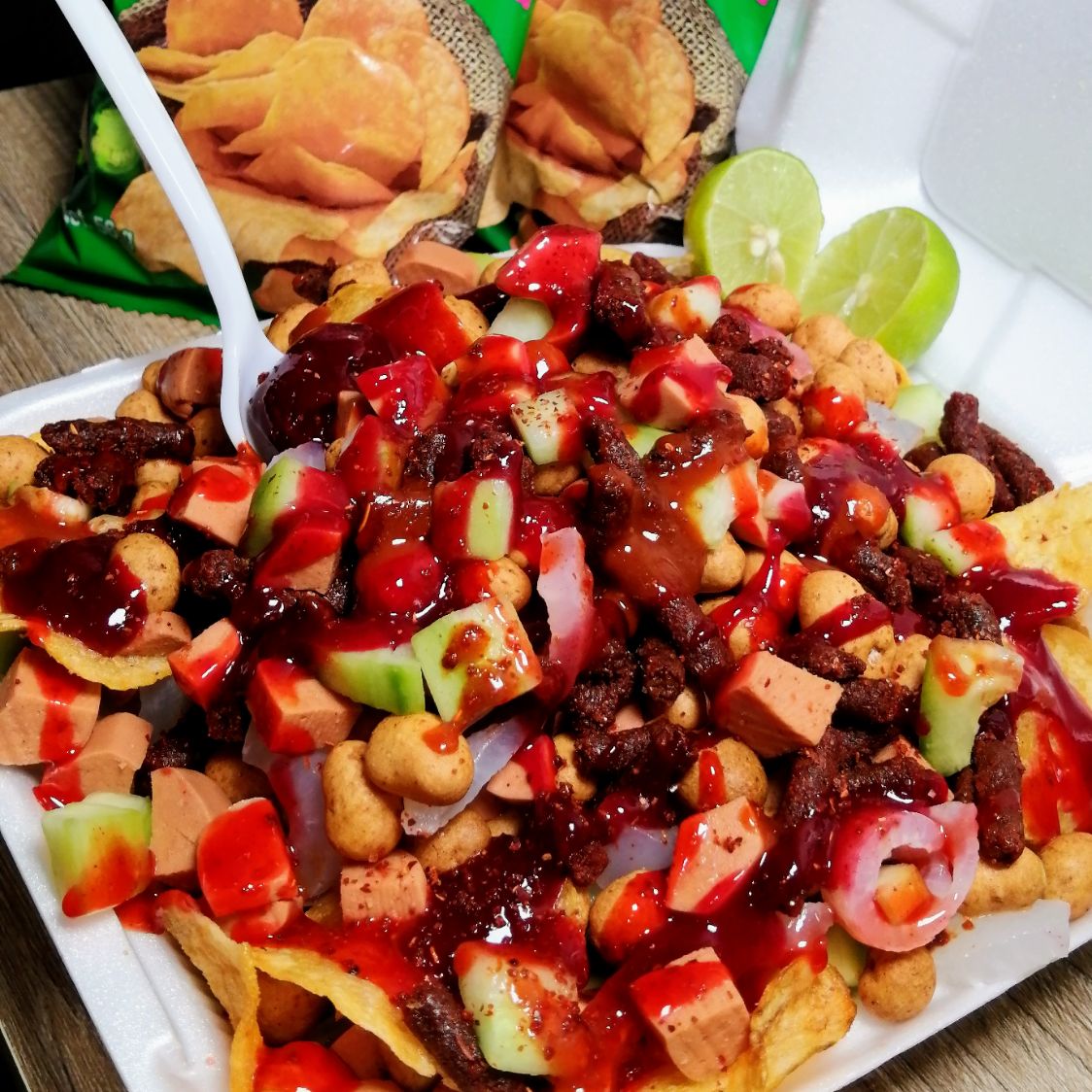 Repollo con zanahoria, pepino, salchicha, cueritos, rielito, cacahuates y sabritas