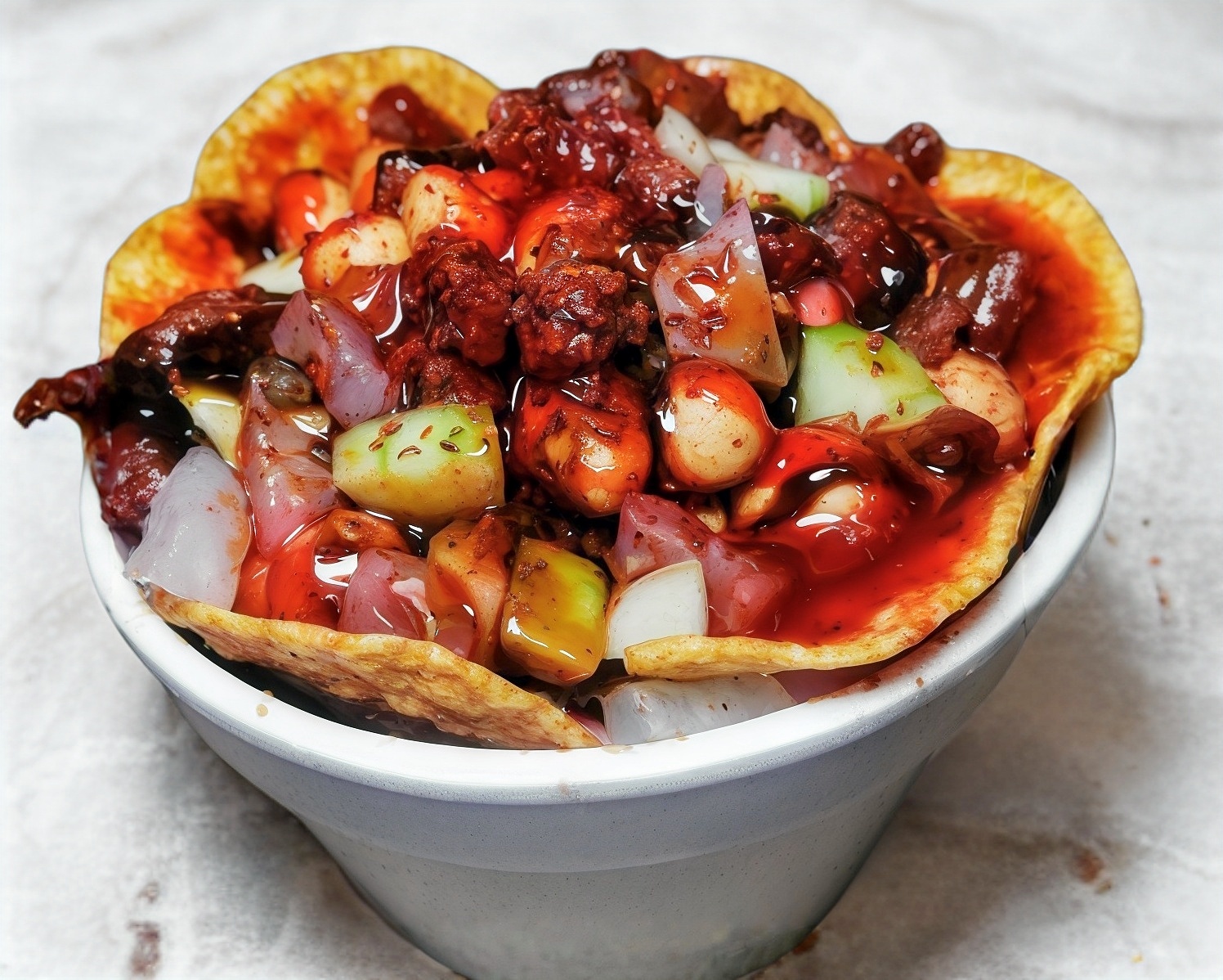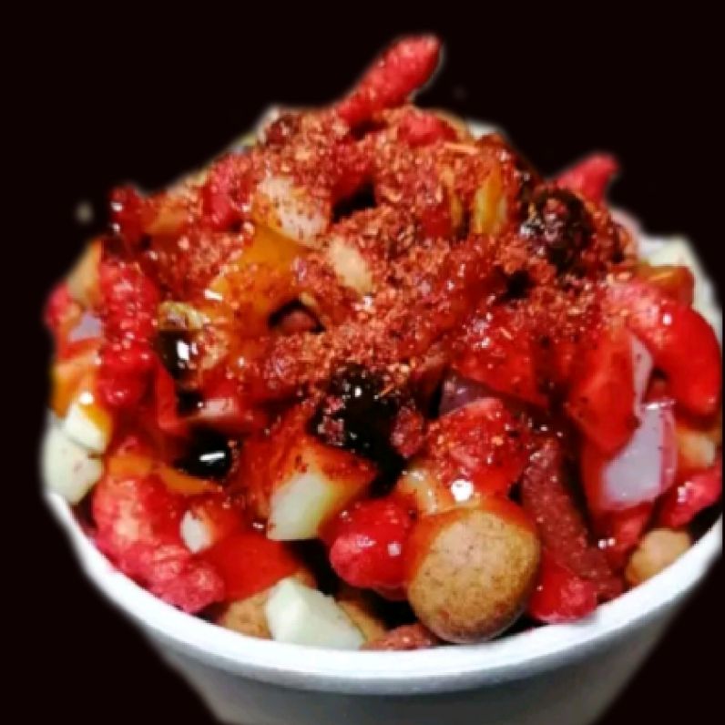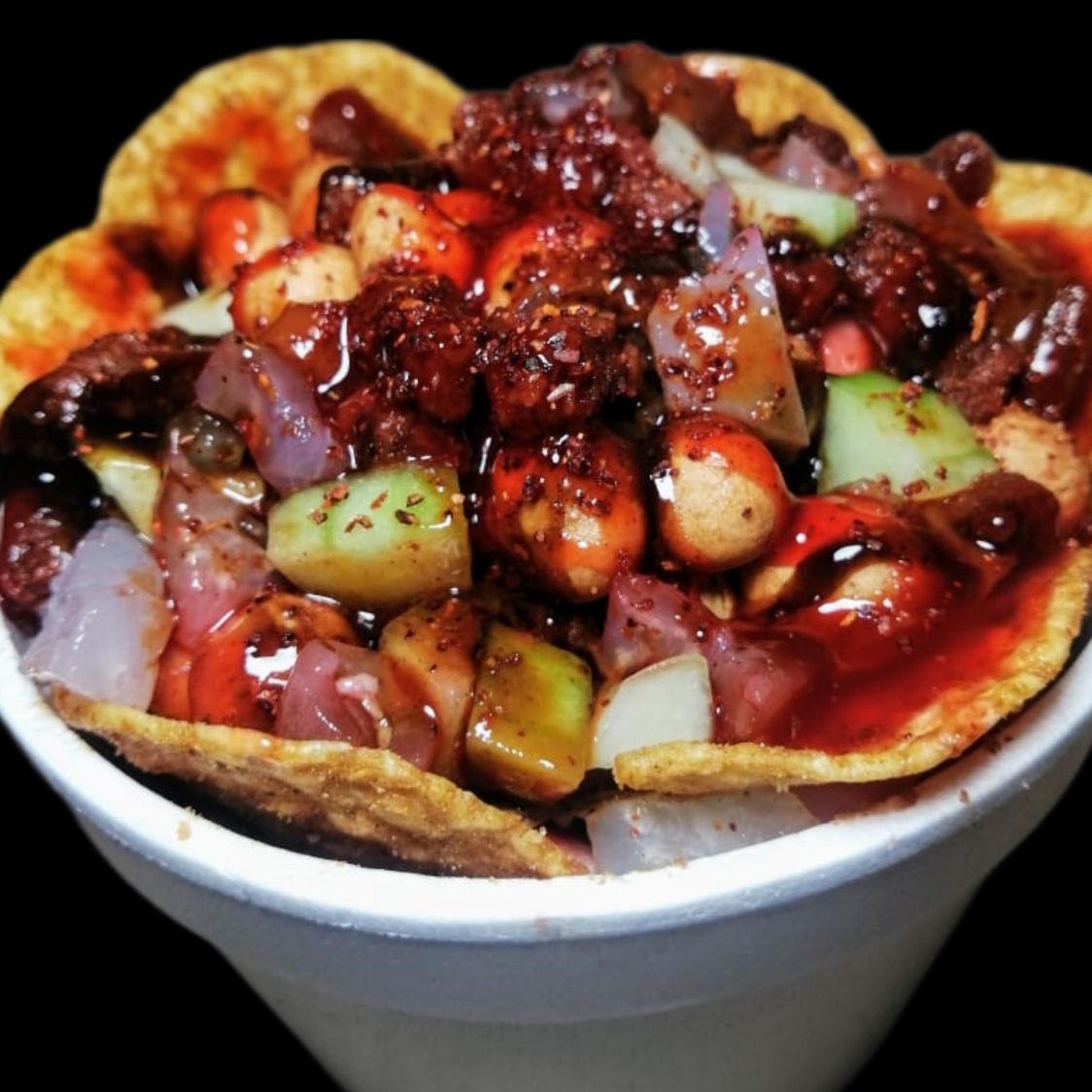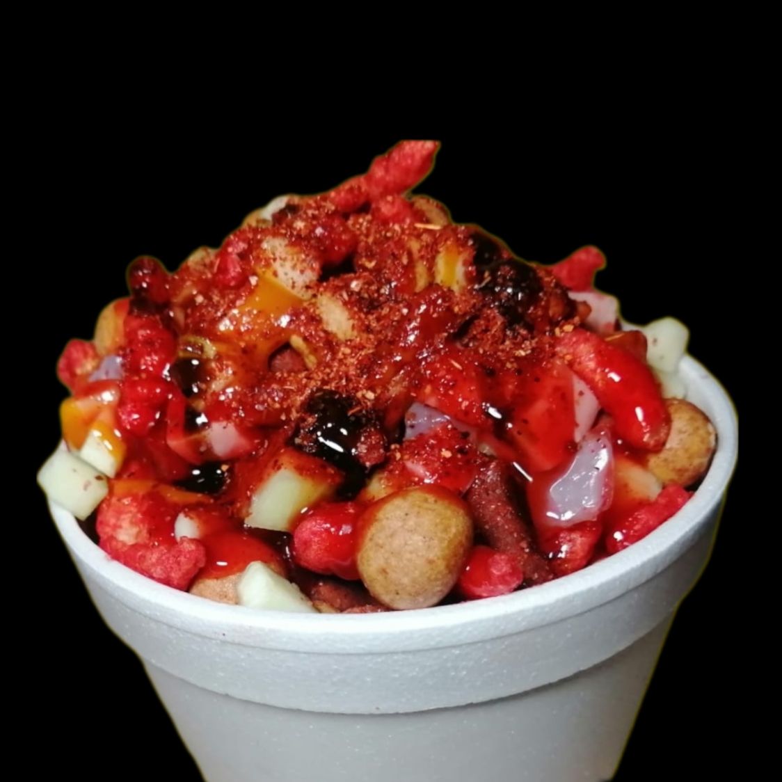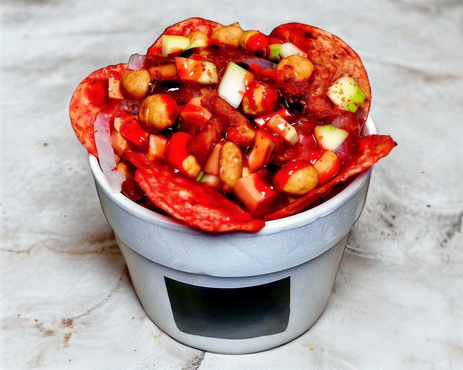 Repollo con zanahoria, pepino, salchicha, cueritos, rielito, cacahuates y sabritas