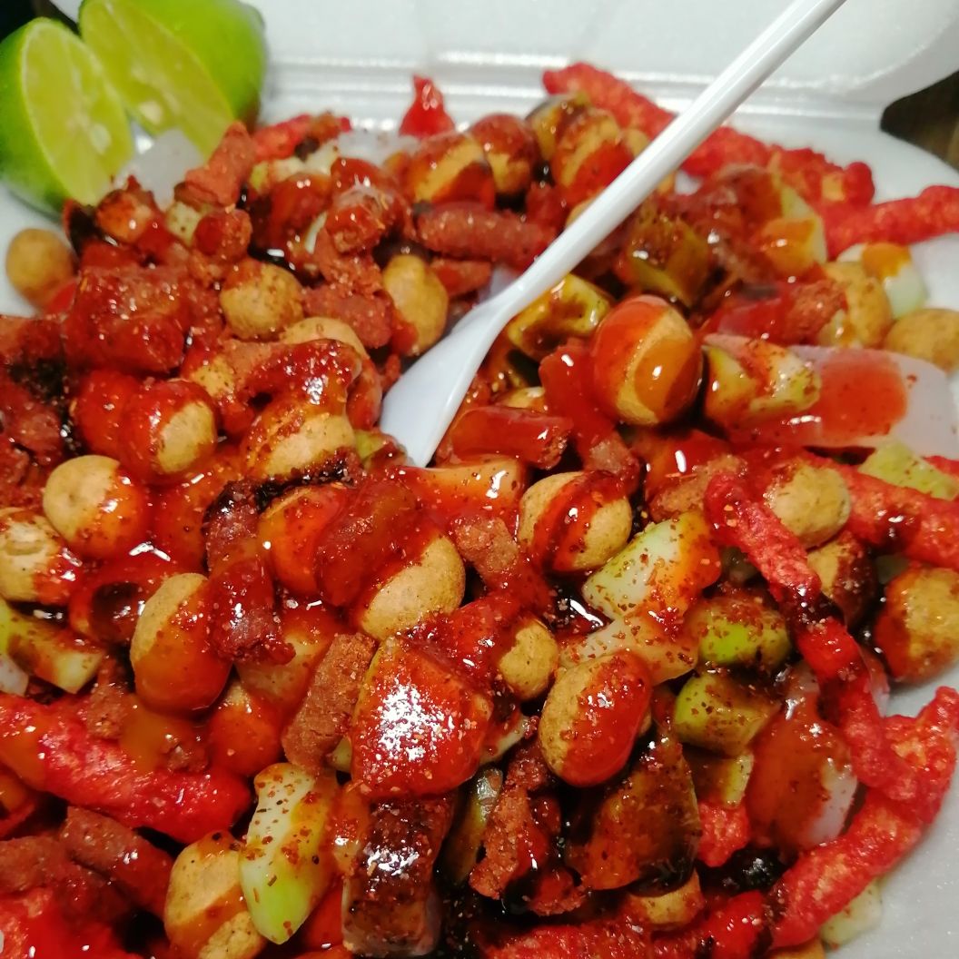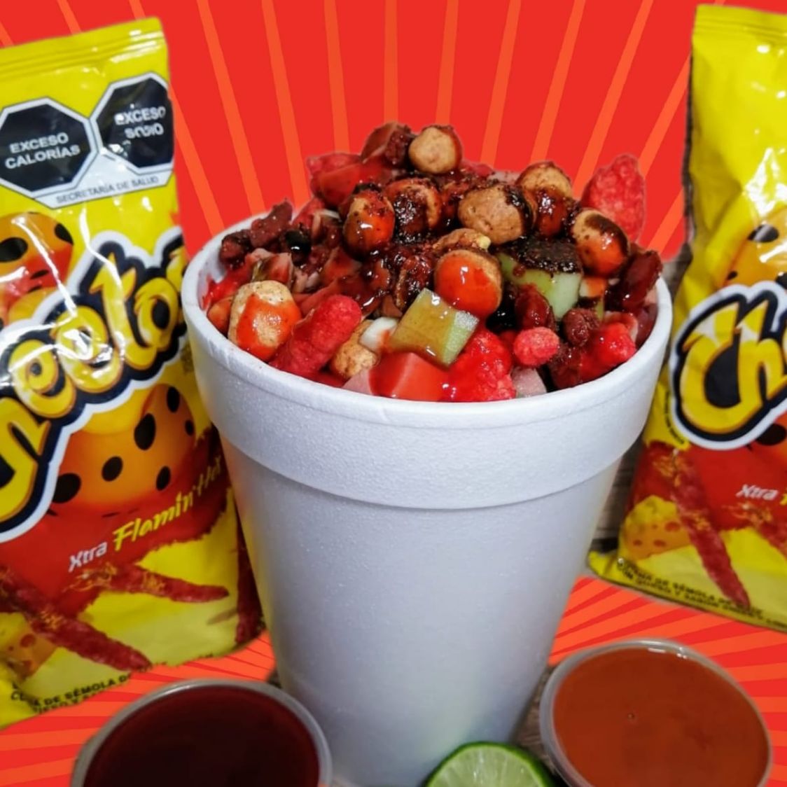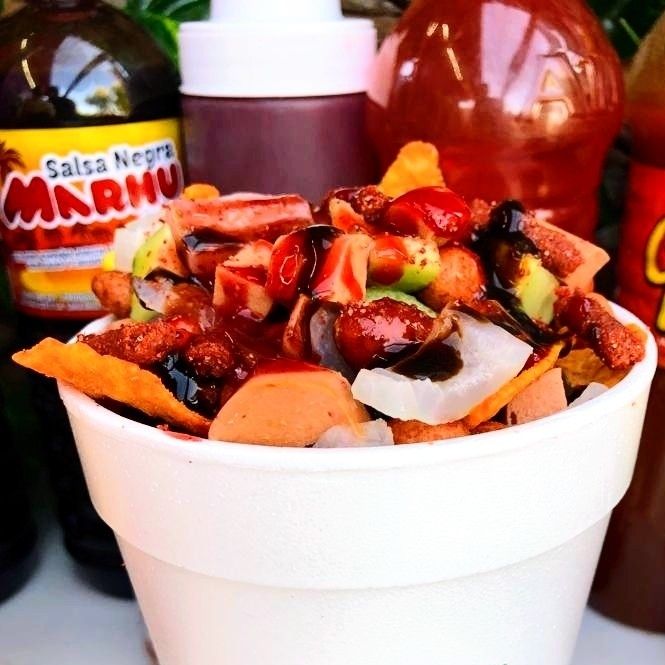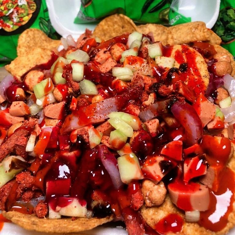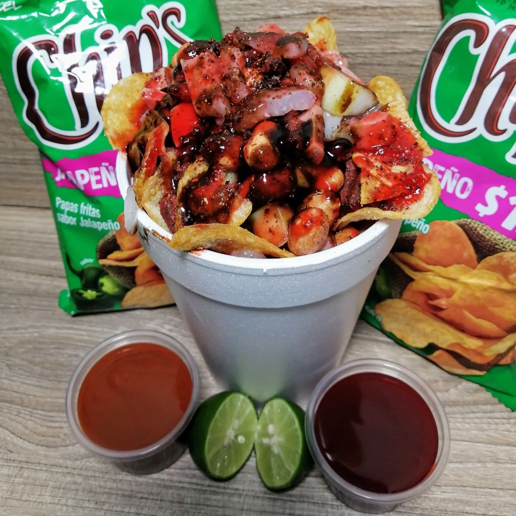 Pepino, cueritos,riel, cacahuates, salchicha, sabritas y salsas
