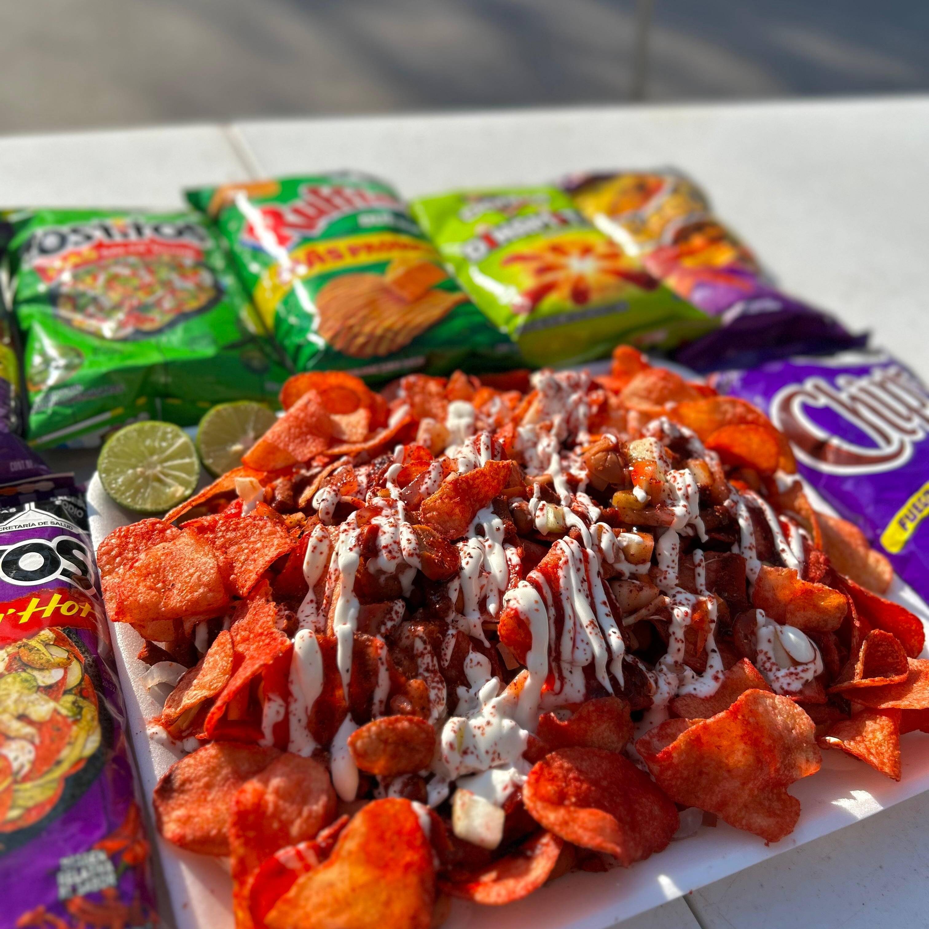 Queso,mayonesa, chipotle,crema,sabritas y limón.