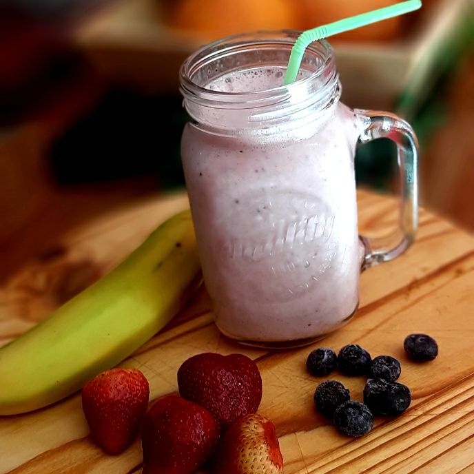 Licuado de fresa, arandano y platano con amaranto