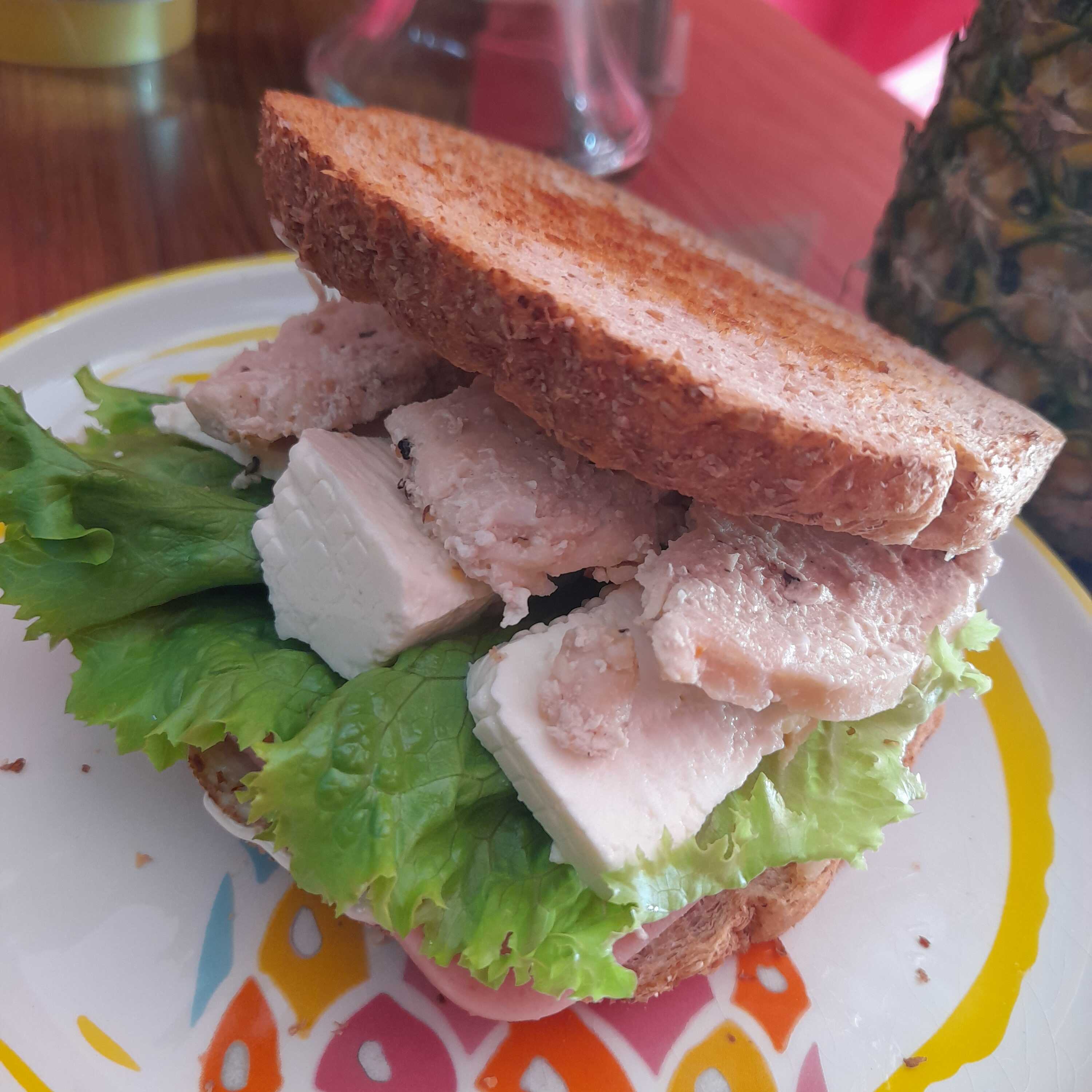 PAN DOBLE CERO, CEBOLLA, TOMATE, AGUACATE, LECHUGA, QUESO MACHEGO, JAMON, POLLO Y PANELA