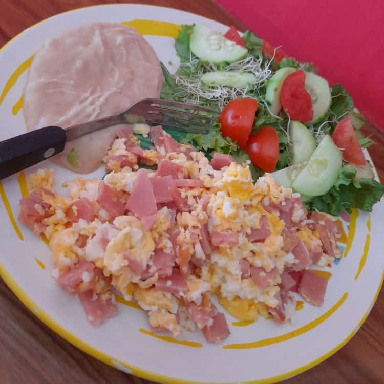 (2 HUEVOS CON JAMON, VERDURA, REVUELTOS O ESTRELLADOS ACOMPAÑADOS DE FRIJOL Y ENSALADA)