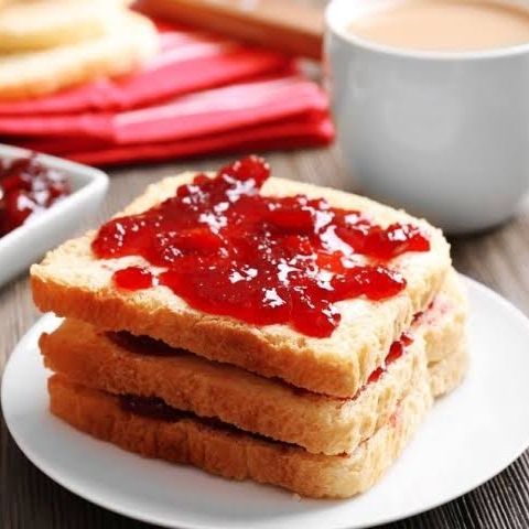 2 rebanadas de pan con mantequilla acompañado de mermelada de fresa