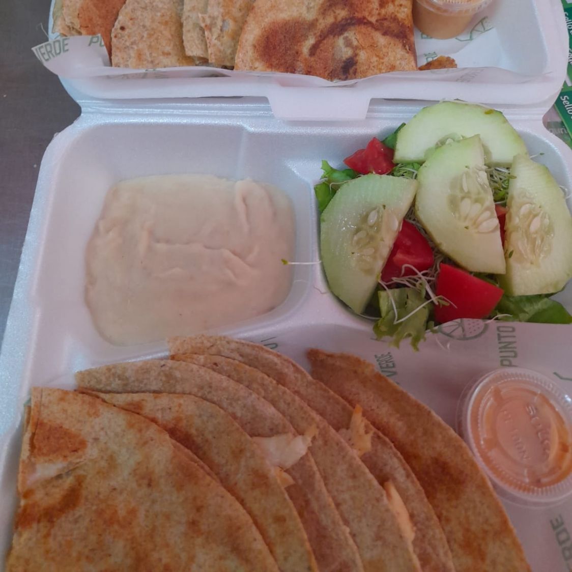 (2 QUESADILLAS INTEGRALES CON POLLO Y ADEREZO CHIPOTLE ACOMPAÑADAS DE ENSALADA Y FRIJOLES)