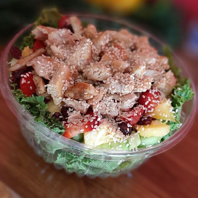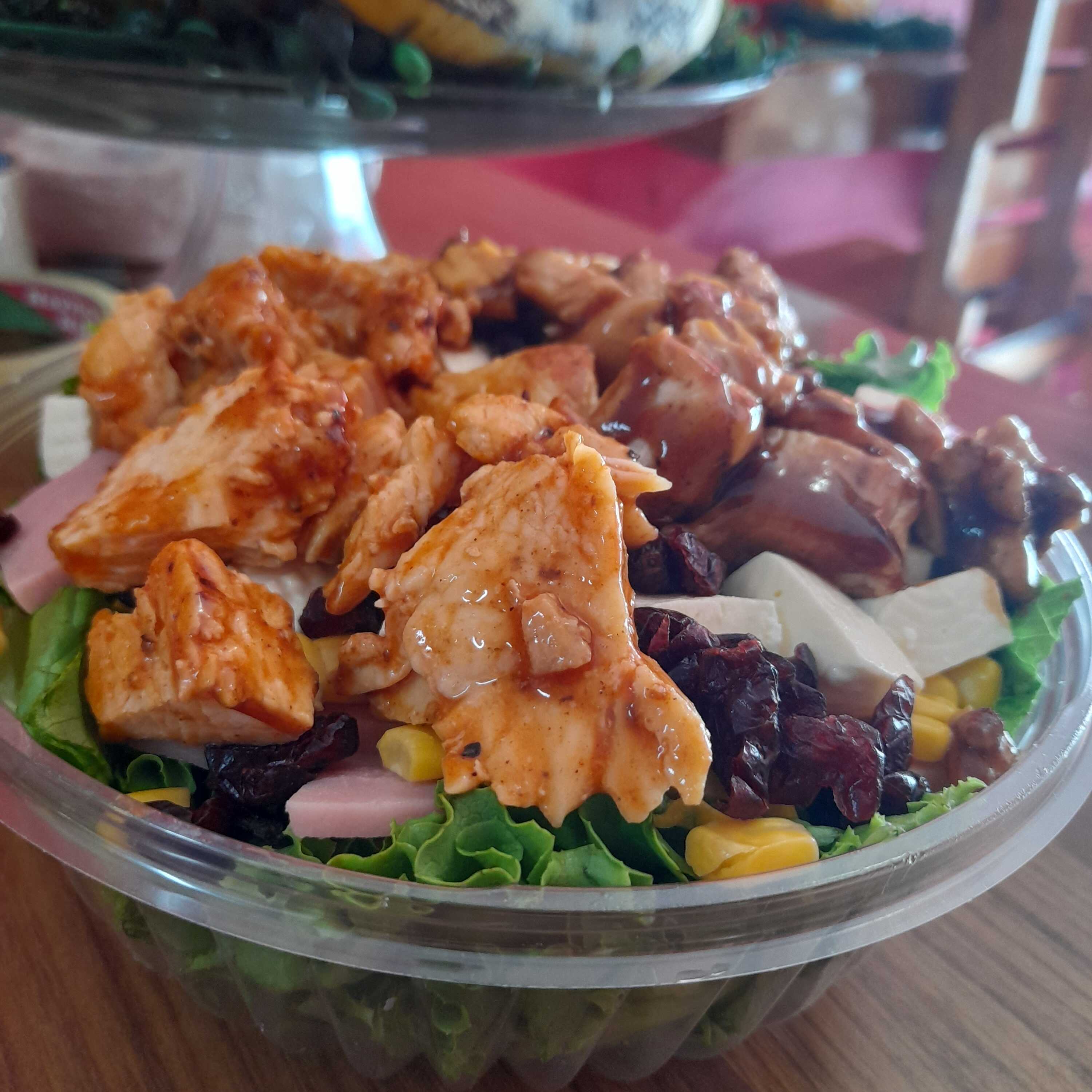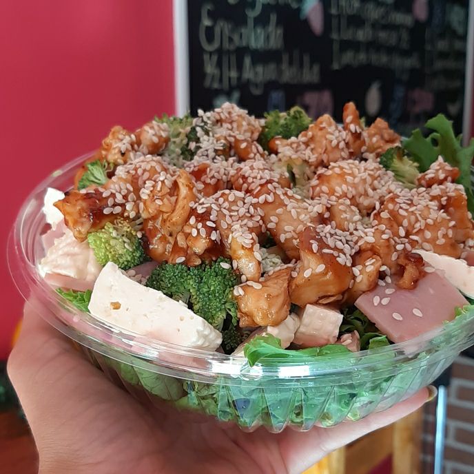 Ensalada chica de 24 oz, lechuga, una porcion de pollo, 3 ingredientes de barra fria, 2 aderezos, ajonjoli, queso parmesano, cruton, fritura o pretzel