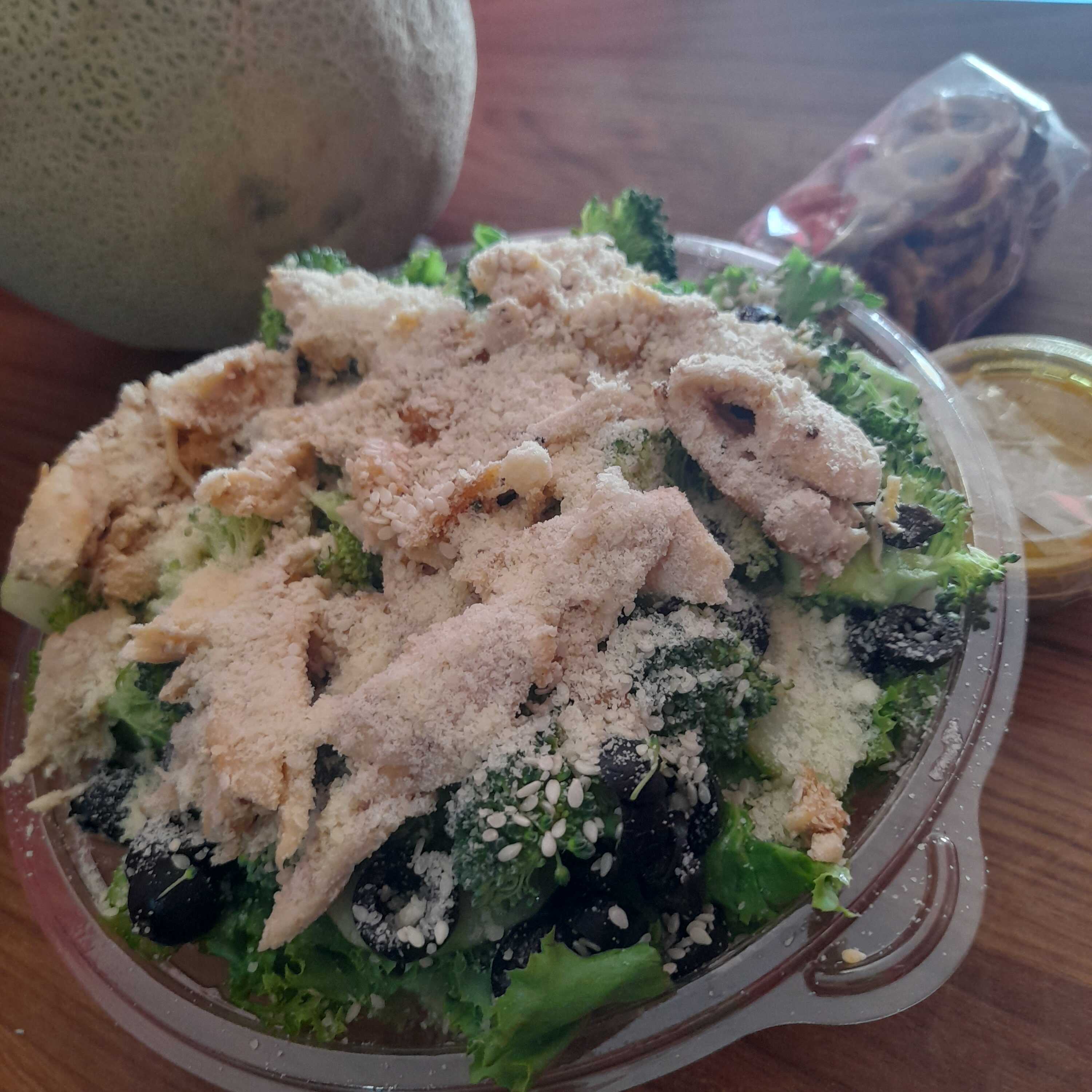lechuga, una porcion de pollo, 3 ingredientes de barra fria, aderezos, ajonjoli, queso pamesano, cruton, fritura o pretzel