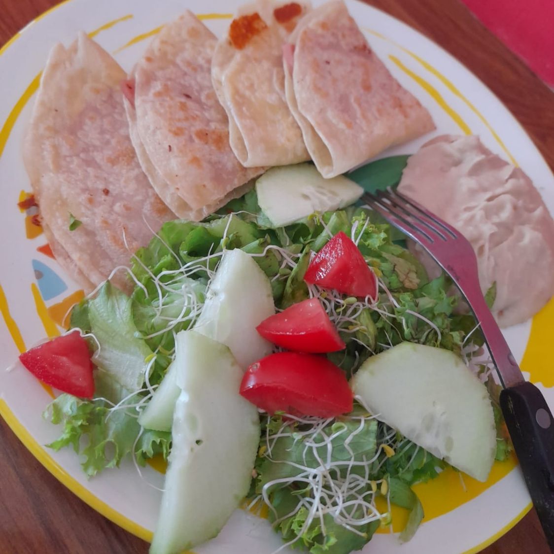 (2 QUESADILLAS INTEGRALES CON JAMON ACOMPAÑADAS DE ENSALADA Y FRIJOLES)