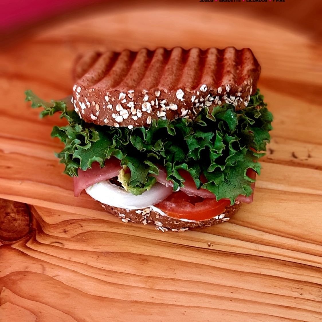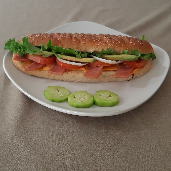 Baguette con 2 ingredientes a elegir (jamón, pollo o panela), lechuga, tomate, cebolla, chile jalapeño, aguacate y queso manchego