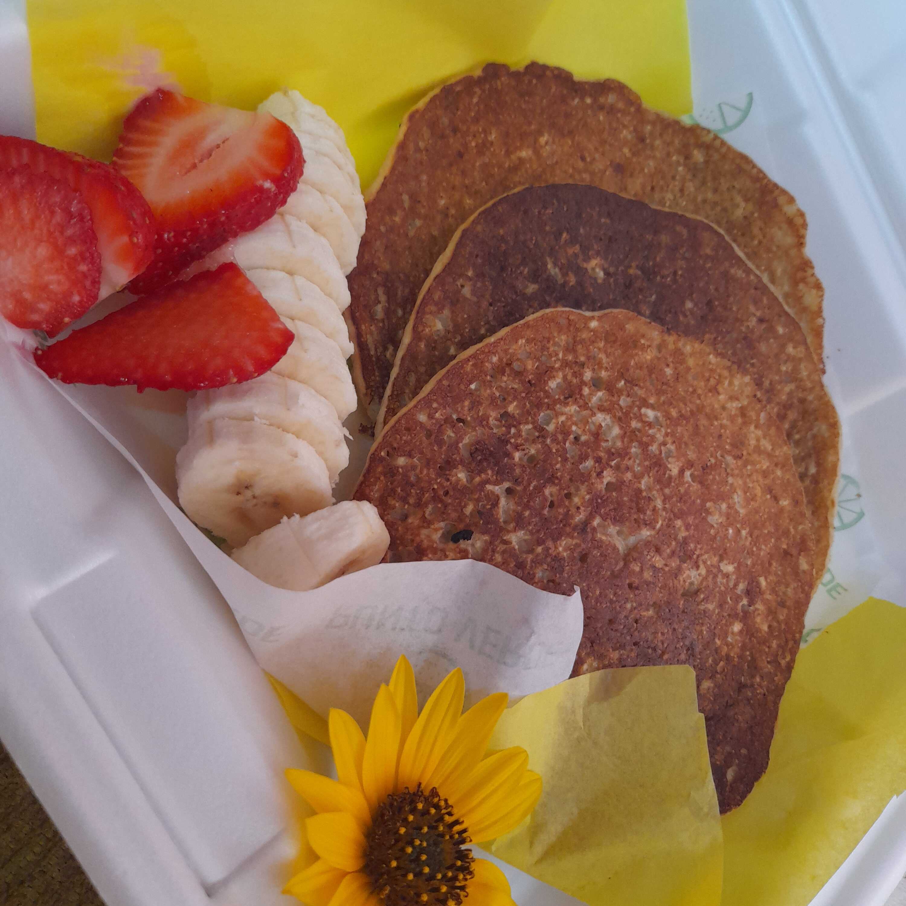 Orden de 3 hot cakes de avena con leche de coco, amaranto y chía acompañados con fruta, coco rallado y miel maple.