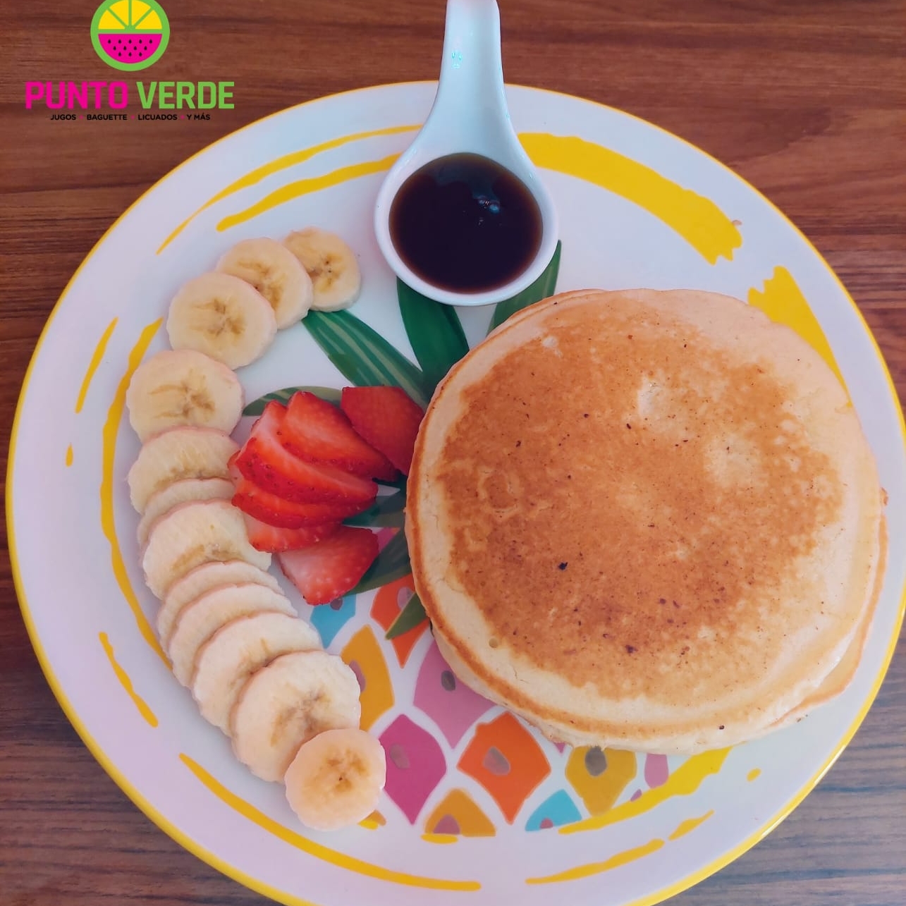 6 mini hot cakes de colores, avena o harina acompañados de miel y fruta.