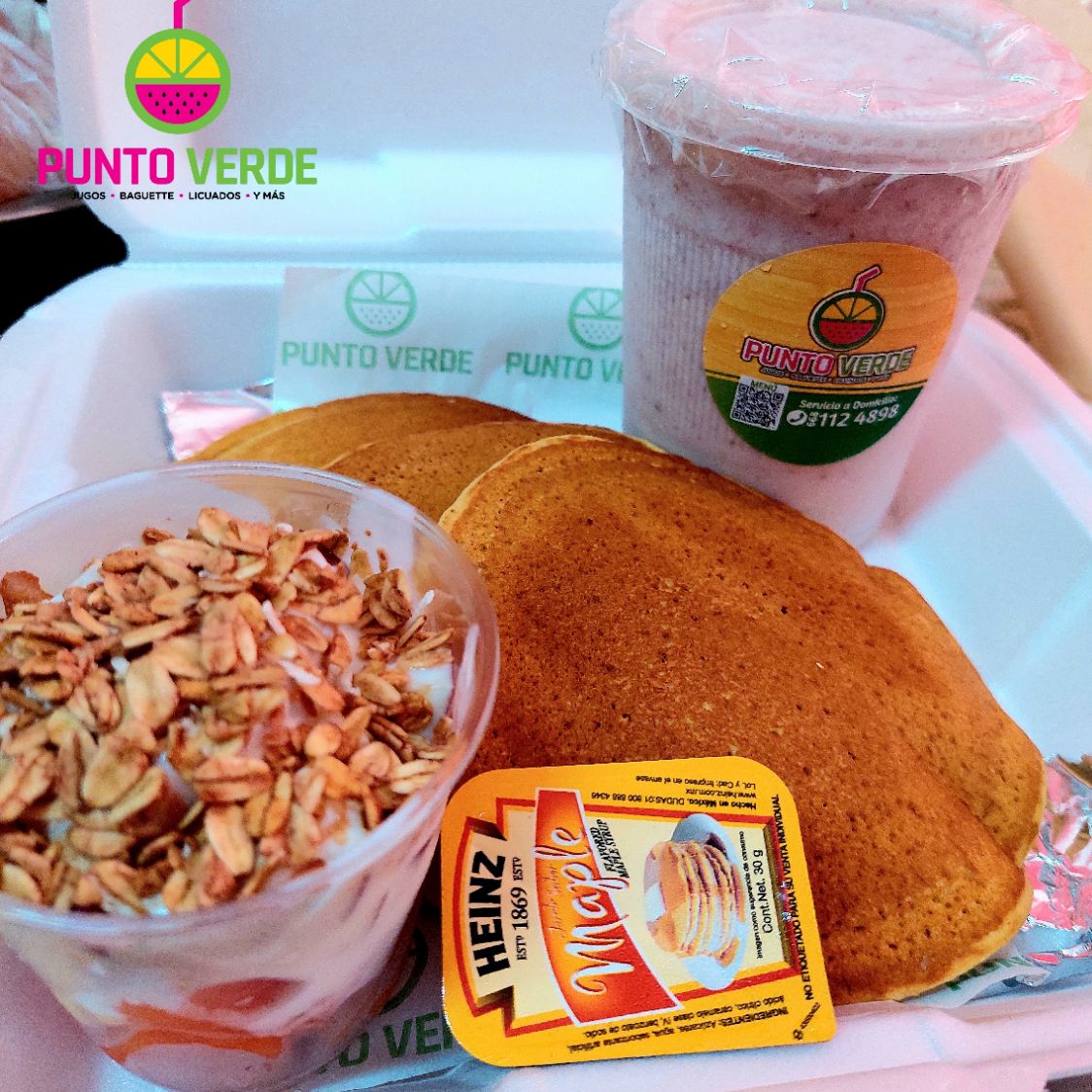 Incluye una orden de hot cakes de avema, un vasito de fruta con yogurt y granola y un licuado de fresa