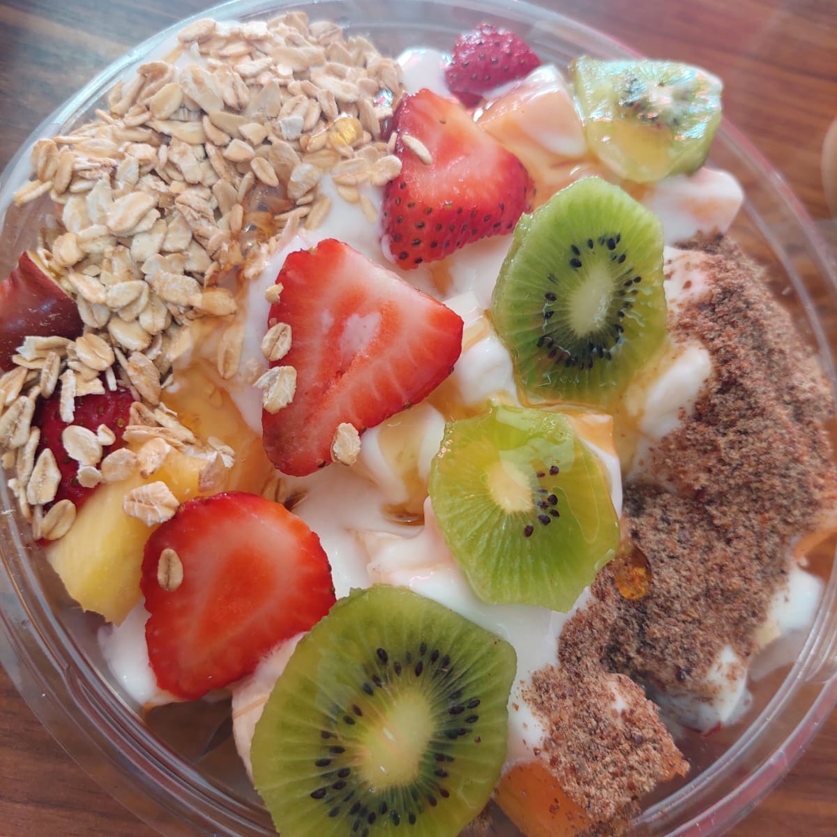 Mini bowl de frutas (papaya, melón, piña, fresa, kiwi, melón, plátano, pera) con yogurt, miel y 2 topping (a elección, envase 12Oz. (Porción personal)
