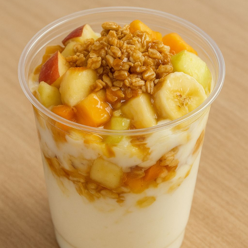 Medio Litro de Yogurt con: Manzana roja, pera, papaya, melon, platano, acompañado de granola y miel