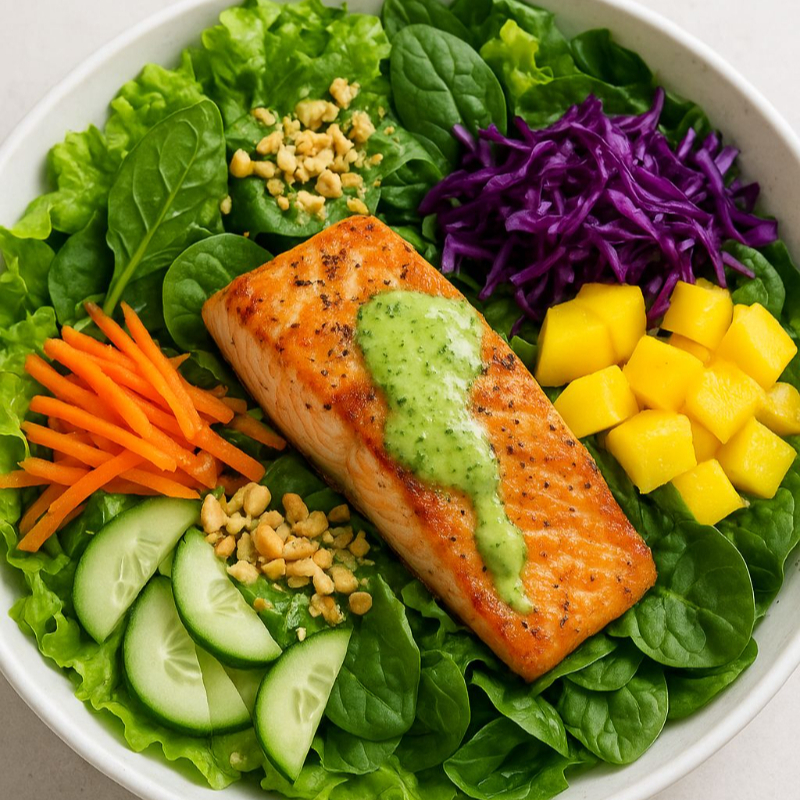 Cama de lechuga. PROTEINA: Salmon, VEGETALES: Col morada, espinaca, mango, zanahoria, pepino, TOPPING: Cacahuate, ADEREZO: Cilantro