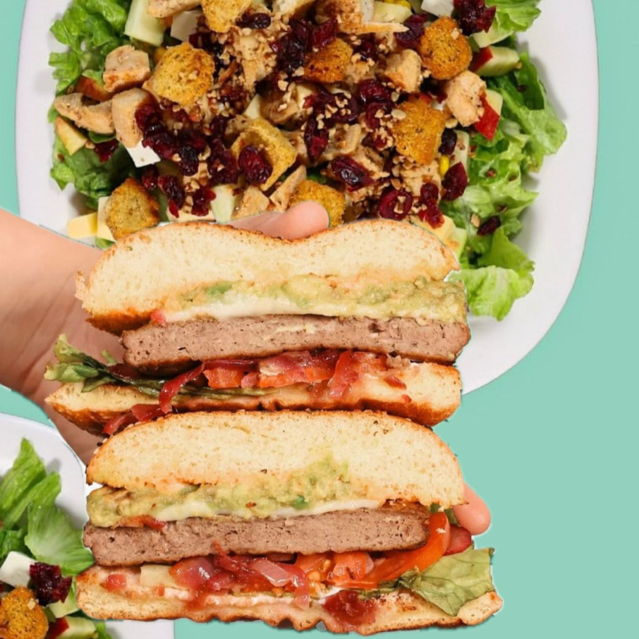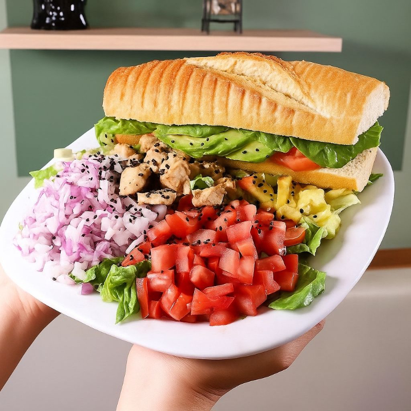 Medio Baguette de pollo y Ensalada sureña que incluye: Base de lechuga, tomate, cebolla, aguacate, piña asada, ajonjoli, de aderezo mostaza miel.