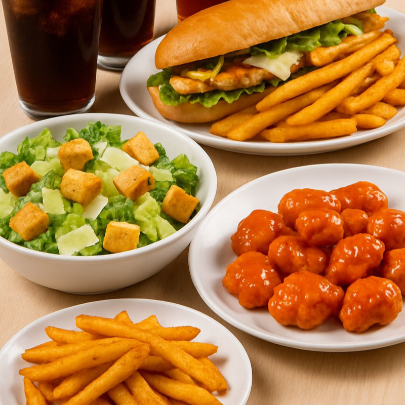 10 Piezas de Boneless, 1 Ensalada Cesar, 1 Baguette de pollo, 1/2 Orden de papas sazonadas 3 bebidas (TÉ)