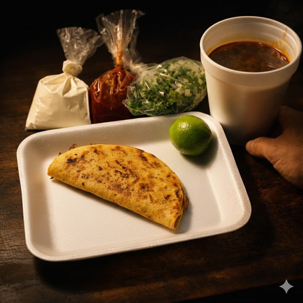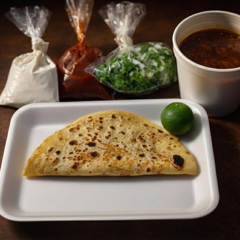 Quesadilla de maiz con birria, incluye: verdura, crema y consome..