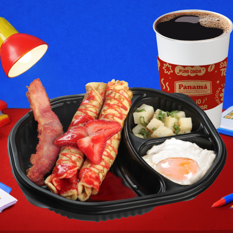 2 panquekis junior con papa campesina, huevo revuelto o estrellado (1 porción) y tocino + café de olla o americano (350 ml), o agua de sabor a elegir (450 ml).