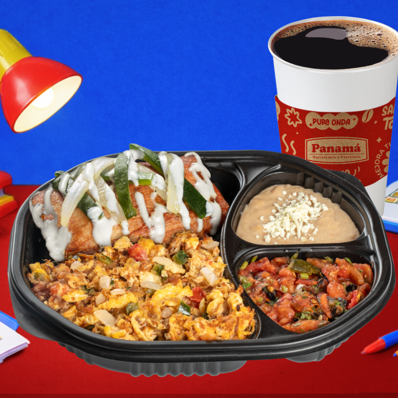 Chicharrón a la mexicana (220 g), frijoles, tortillas y salsa tatemada + café de olla o americano (350 ml), o agua de sabor a elegir (450 ml).