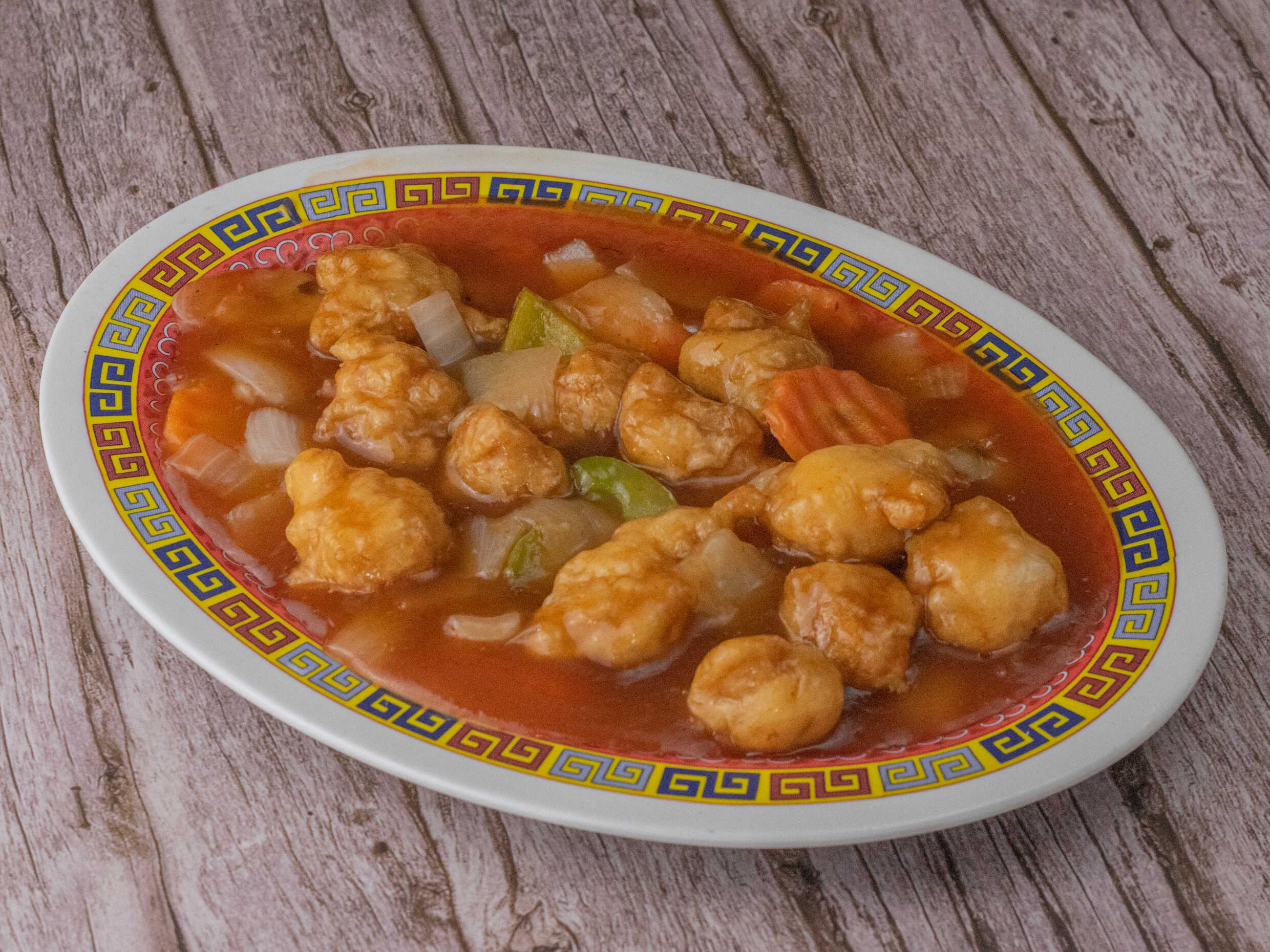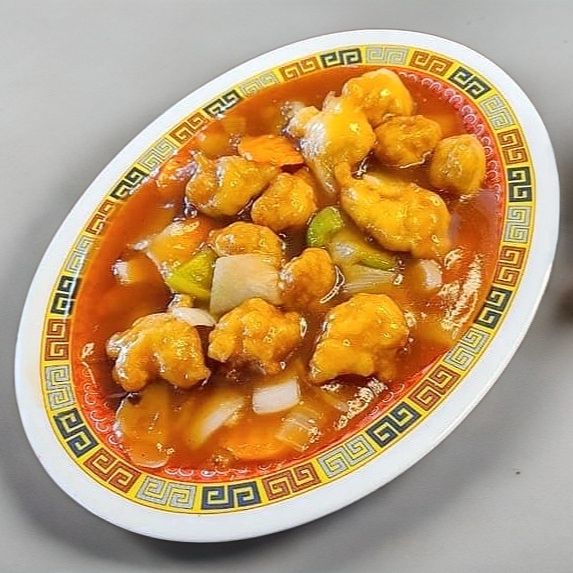 Proteína de tu elección, capeada y crujiente bañada con gravy de consistencia cremosa, reducido con zanahoria, cebolla, piña y pimiento morrón.